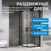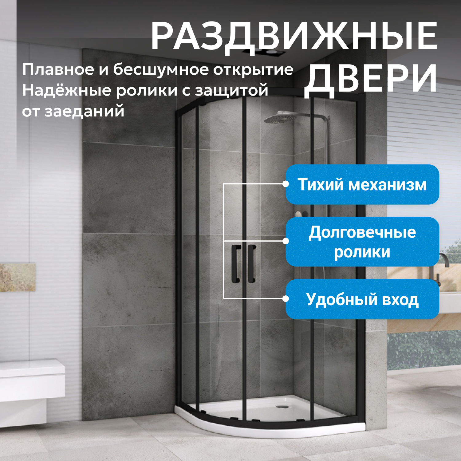 Конструкция состоит из двух раздвижных дверей с металлическими ручками для удобного использования и ухода. Ширина входа 464 мм обеспечивает комфортный проход. Поддон не входит в комплект, его можно подобрать индивидуально; модель совместима с низкими поддонами, что визуально облегчает конструкцию.