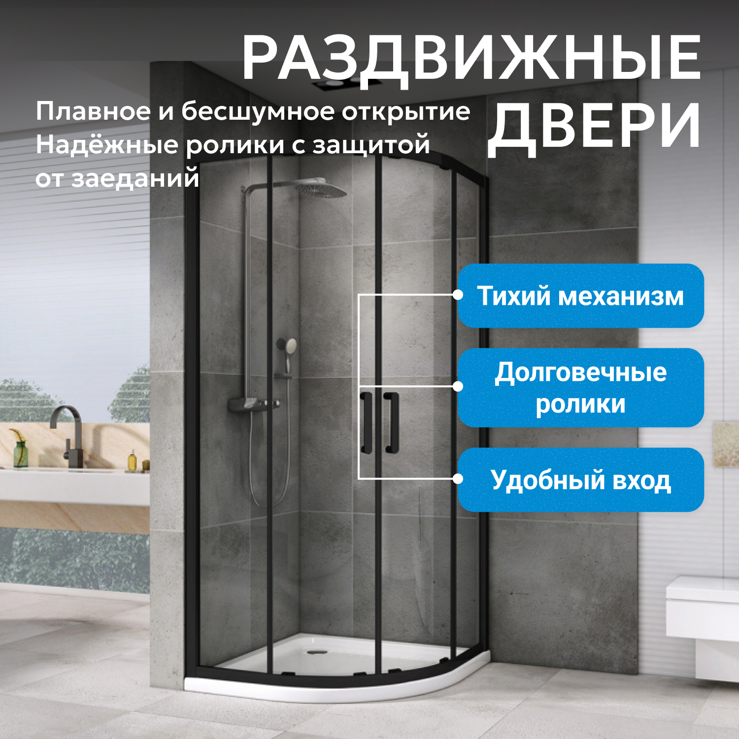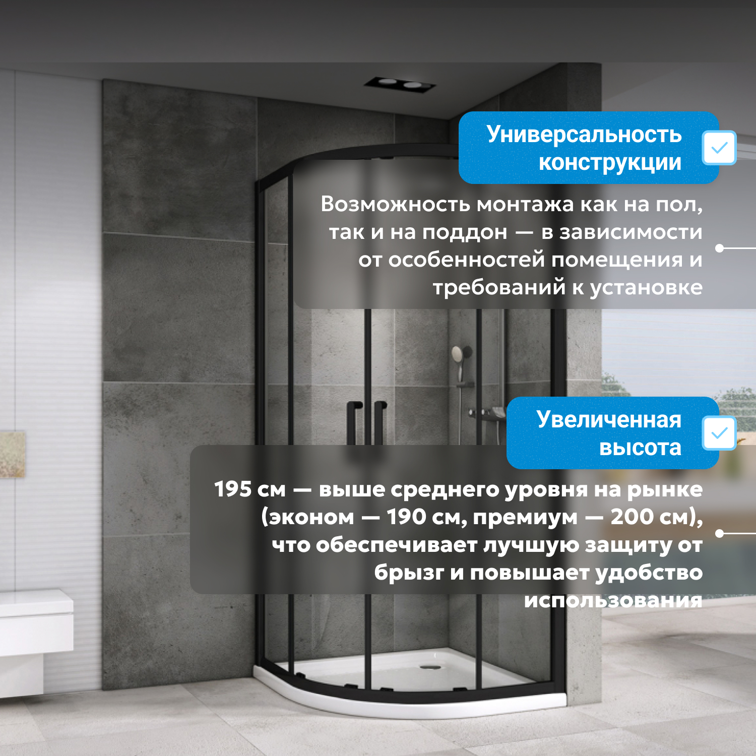 Комплектация включает две раздвижные двери на двойных роликах для плавного перемещения. Металлические ручки удобны в эксплуатации. Уголок универсален: допускает монтаж с разных сторон и установку на низкий поддон, приобретаемый отдельно. Высота — 195 см, вход — 524 мм. Конструкция рассчитана на высокие нагрузки, выдерживает длительное использование, отличается немецким качеством сборки.