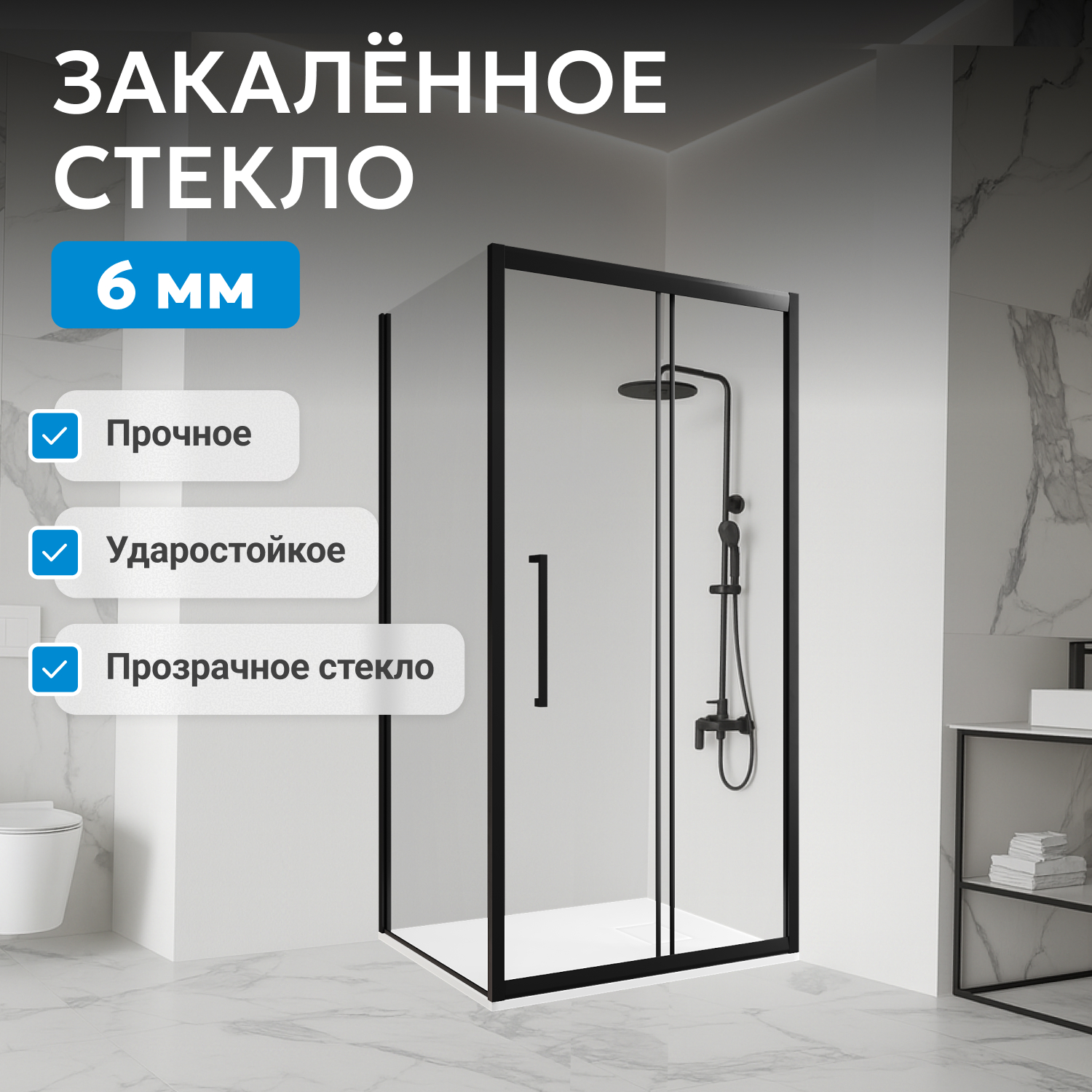 Изделие выполнено из прозрачного закалённого стекла толщиной 6 мм. Прямоугольная форма и чёрный профиль сочетаются с разными стилями ванной комнаты. Увеличенные металлические ручки повышают удобство. Универсальная конструкция предусматривает монтаж с левым или правым открыванием.