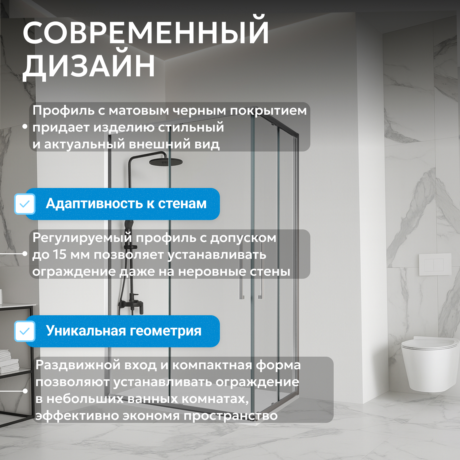 Установка в угол позволяет рационально использовать пространство. Универсальная модификация облегчает монтаж в разных планировках. Двойные ролики на дверях рассчитаны на интенсивное использование, отсутствие доводчиков упрощает уход за механизмом. Все элементы выполнены из износостойких материалов, предоставляется гарантия 3 года.