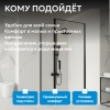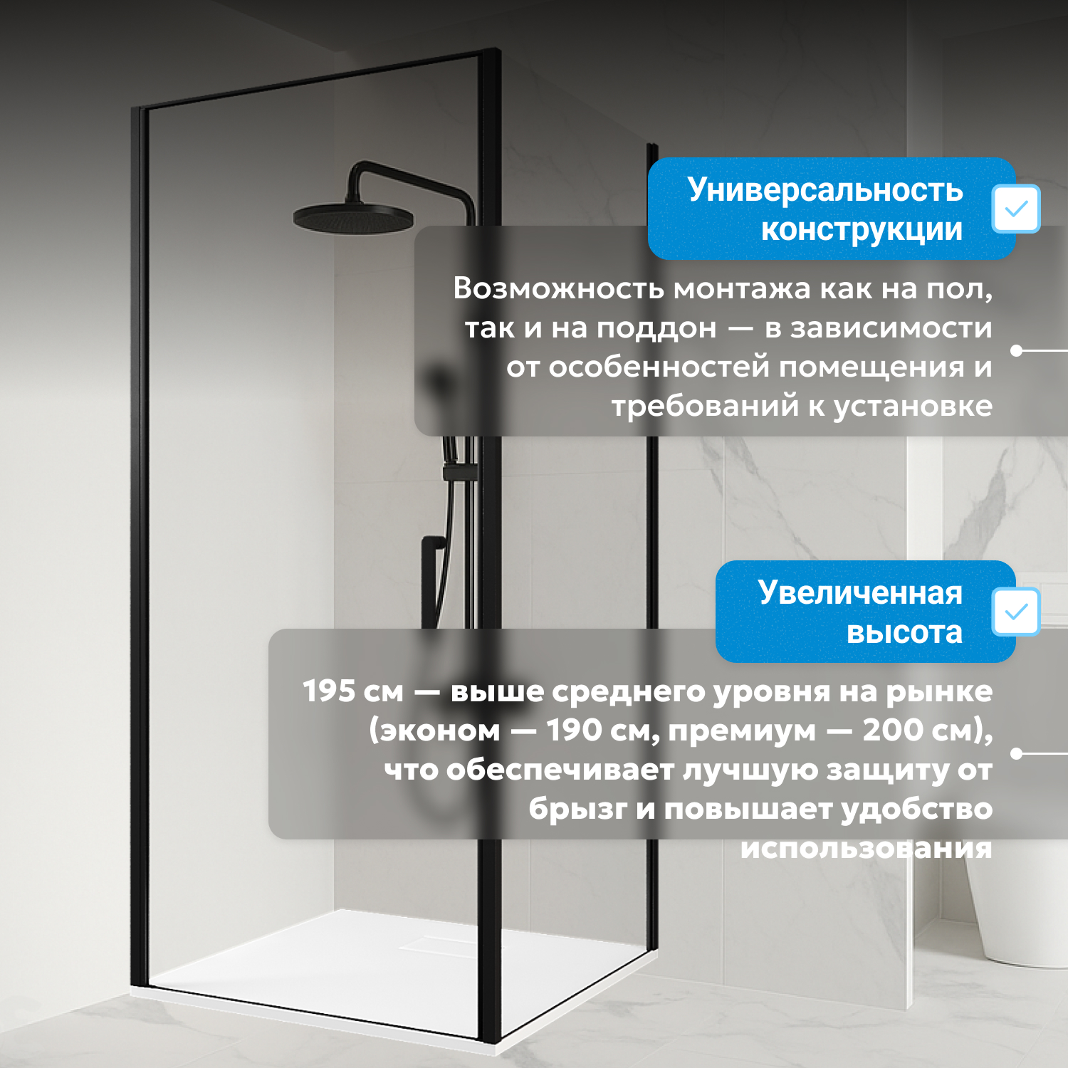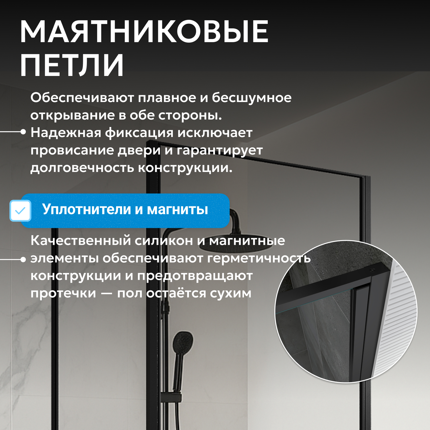 Распашная дверь на маятниковой петле открывается внутрь и наружу, оснащена металлической ручкой для удобства и надежности. Монтаж проводится в угол помещения, низкий поддон приобретается отдельно, что дает возможность подобрать вариант установки под требования ремонта.