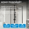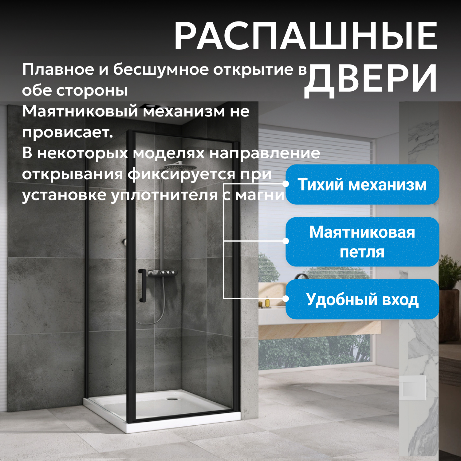 Модель поставляется без поддона, что даёт возможность выбрать подходящее решение для вашего интерьера. Металлическая ручка соответствует современному стилю и обеспечивает комфорт при использовании. Высота уголка — 195 см, подходящая для большинства ванных комнат.