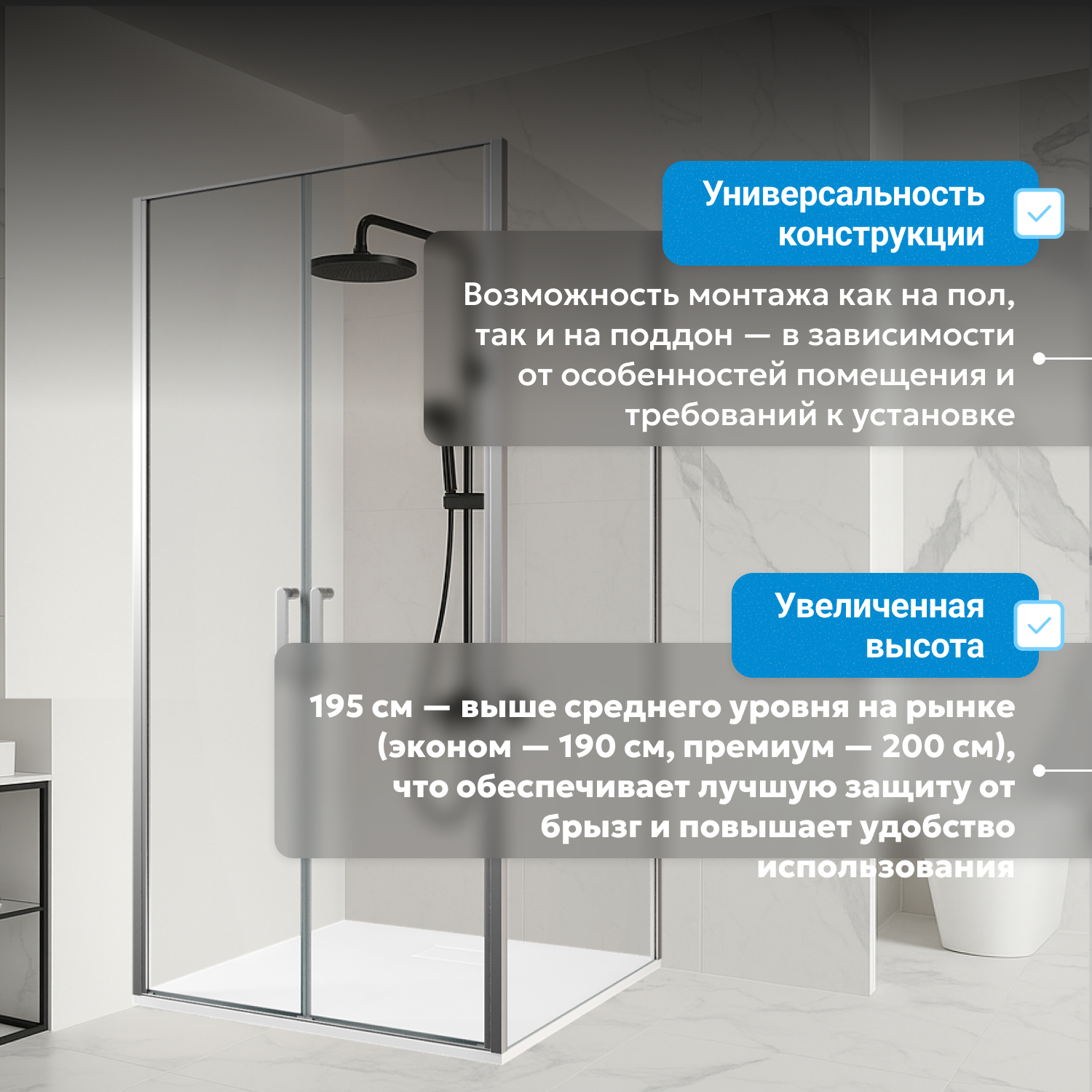 Две распашные двери на маятниковых петлях открываются внутрь и наружу, обеспечивая проход шириной 881 мм. Хромированный профиль защищен от коррозии, металлические ручки дополняют дизайн и повышают удобство эксплуатации.