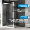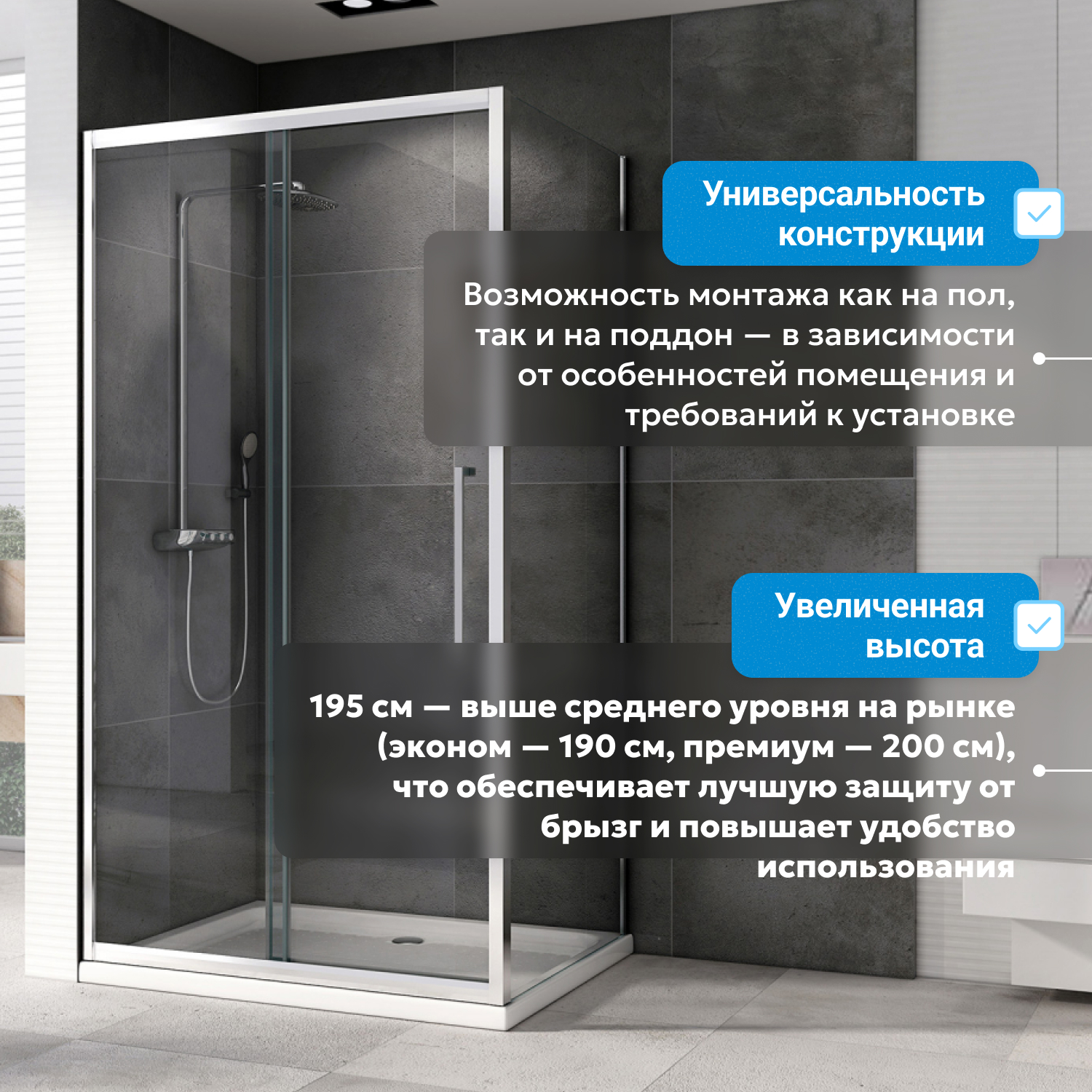 Уголок оснащён одной раздвижной дверью на двойных роликах для плавного хода и удобного открывания, а увеличенная металлическая ручка облегчает захват. Ширина входа составляет 398 мм, что оптимально для экономии пространства. Универсальная модификация допускает адаптацию монтажа под особенности помещения.
