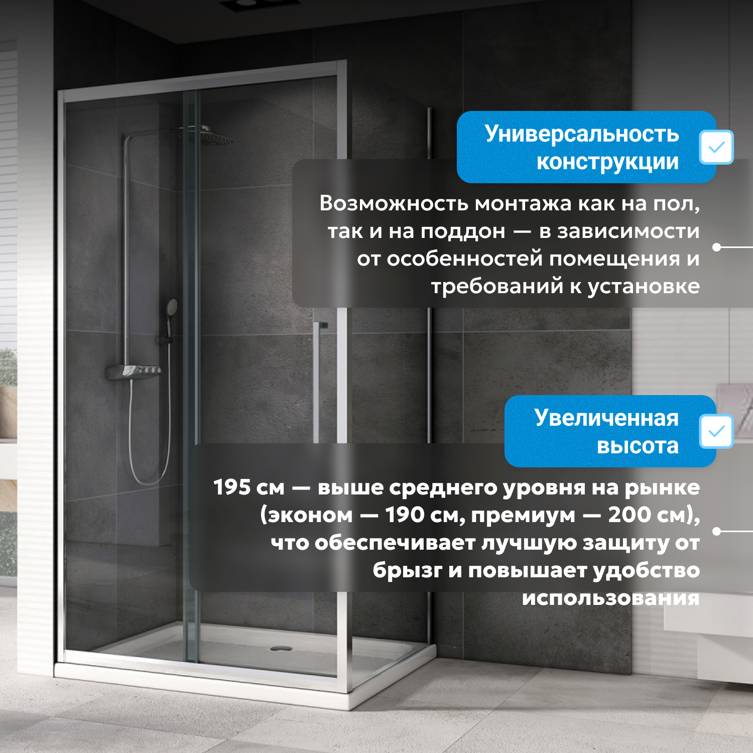 Угловой монтаж оптимален для небольших помещений. Раздвижная дверь на двойных роликах обеспечивает удобный вход без необходимости дополнительного пространства для открывания. В комплекте – увеличенная металлическая ручка. Поддон приобретается отдельно; рекомендуется выбирать низкий вариант для визуальной легкости.