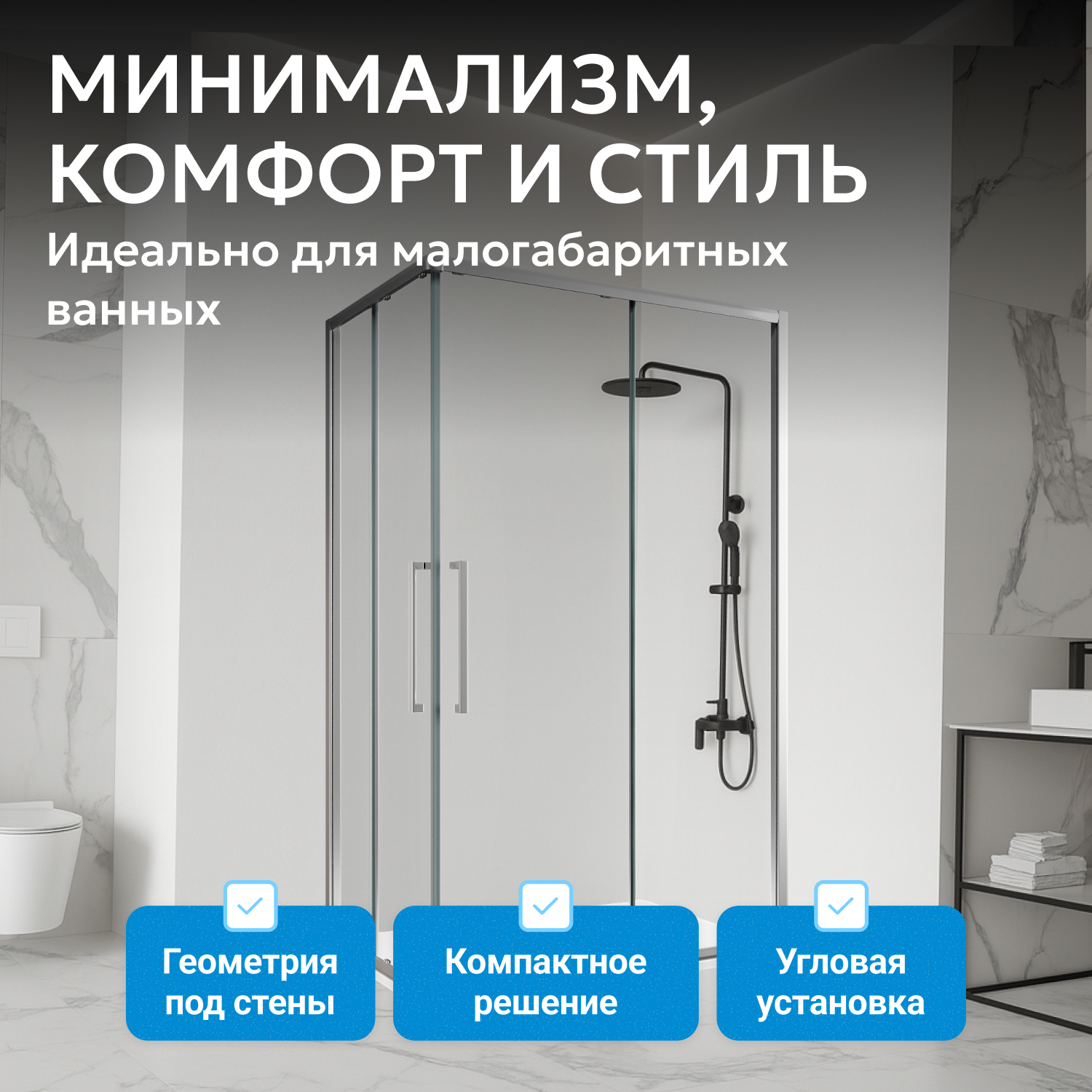 Модель оснащена двумя раздвижными дверями на двойных роликах для плавного и тихого открывания. Вход шириной 585 мм обеспечивает комфорт. Эргономичные металлические ручки устойчивы к влаге. Отсутствие поддона позволяет подобрать вариант с учётом особенностей помещения.