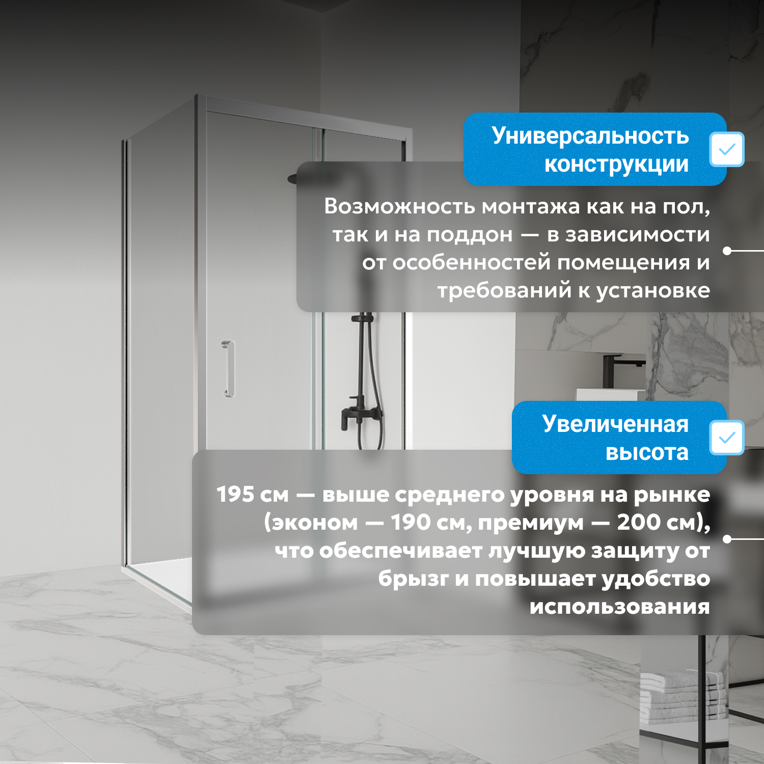 Прозрачное закалённое стекло толщиной 5 мм обеспечивает прочность и безопасность, а хромированный профиль придаёт лаконичный внешний вид, органично сочетающийся с другими сантехническими элементами. Высота конструкции — 190 см, ширина — 70 см, длина — 120 см, что подходит для большинства типовых и компактных санузлов.