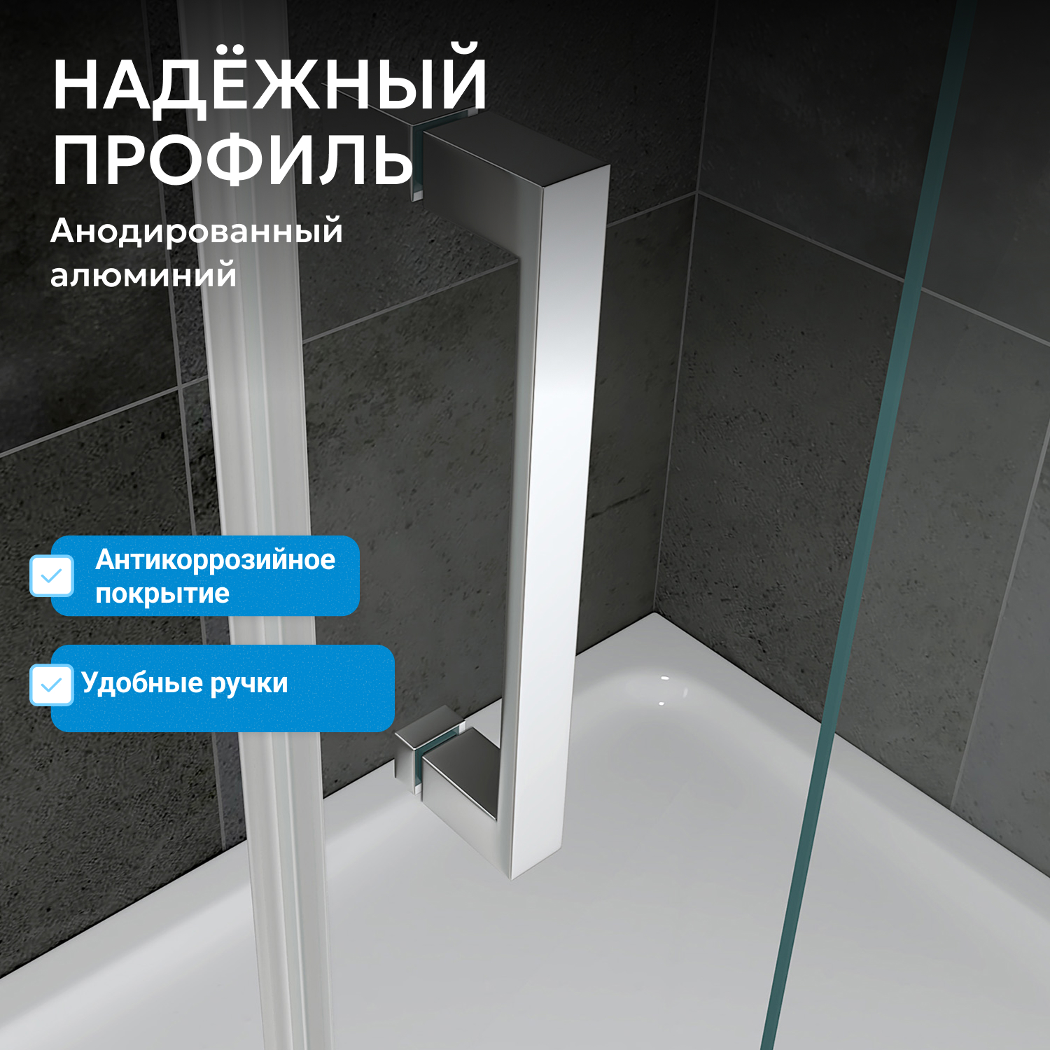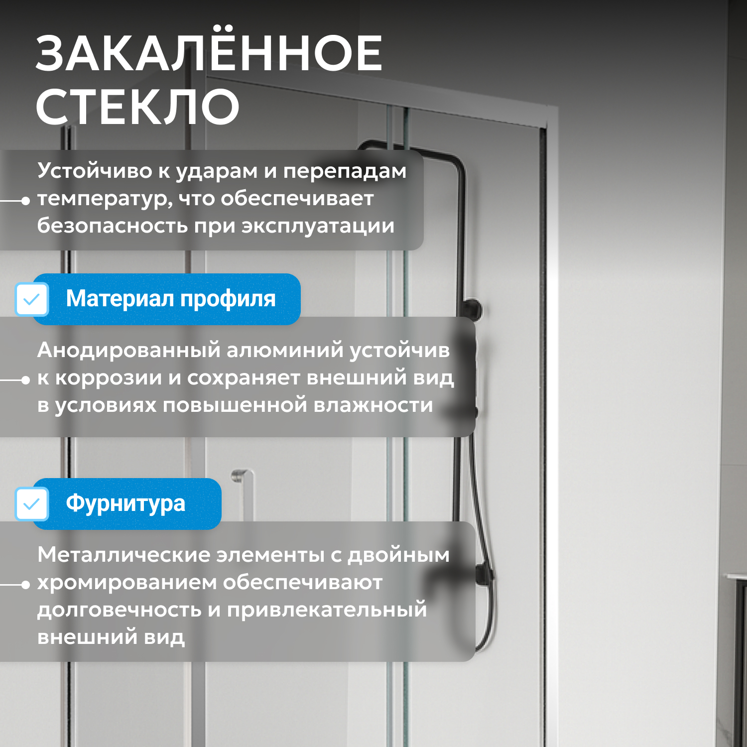 В комплекте нет поддона, что позволяет выбрать подходящий по типу и высоте в зависимости от предпочтений. Раздвижная дверь с одной створкой обеспечивает удобный доступ, минимизируя занимаемое пространство. Конструкция допускает установку на нужную сторону, что облегчает монтаж и адаптацию к условиям помещения.