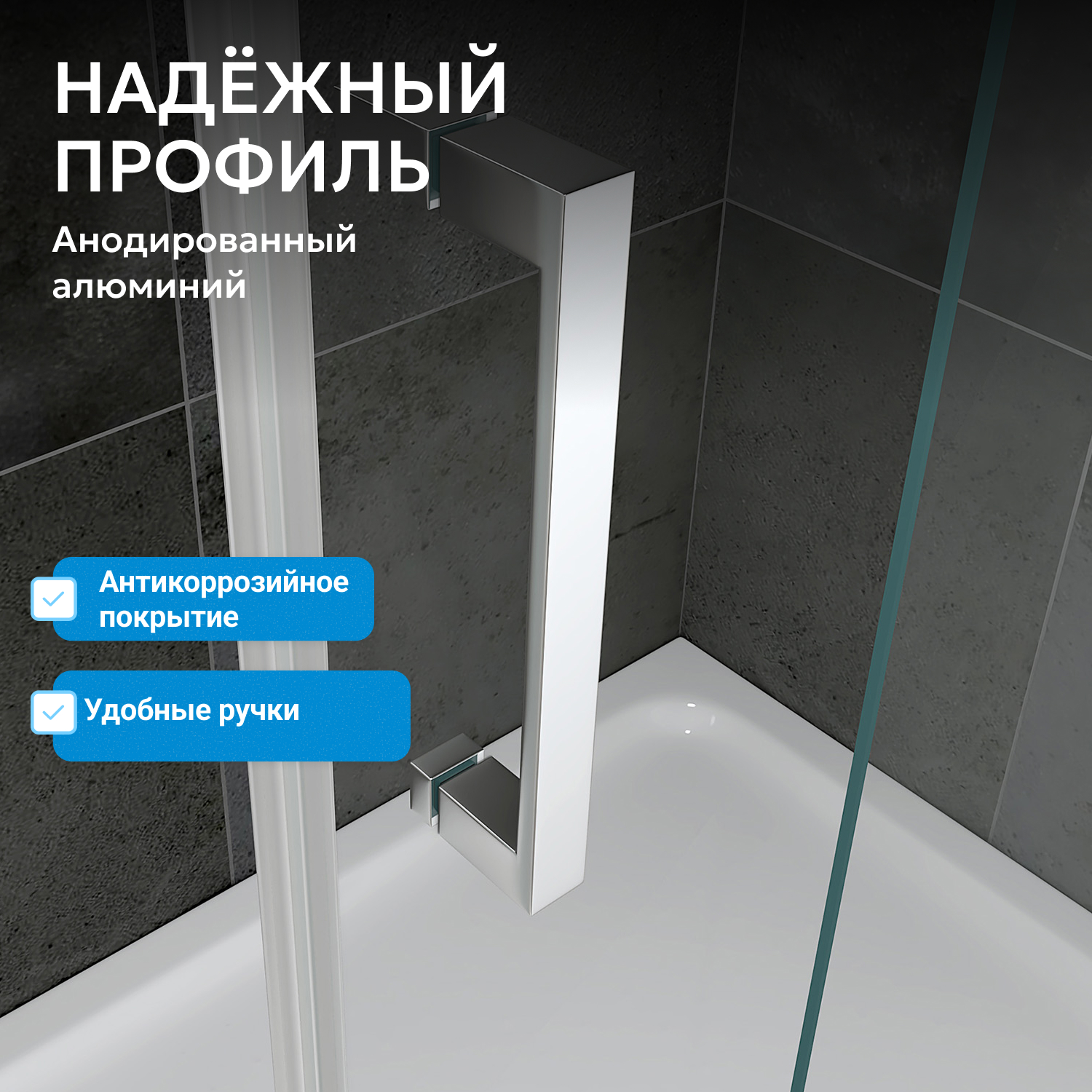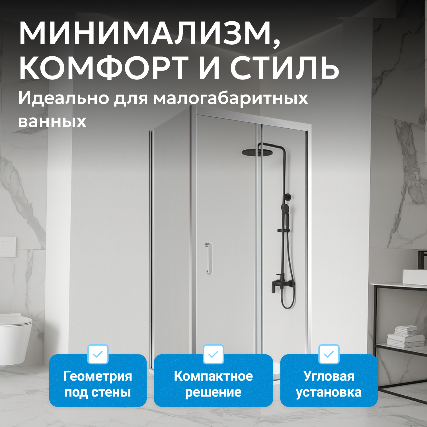 Модель устанавливается в угол помещения, эффективно зонирует пространство и экономит площадь. Одна раздвижная дверь с хромированным профилем устойчива к коррозии, механизм работает плавно. Прозрачные панели универсальны для любого интерьера и визуально увеличивают комнату. Универсальный монтаж позволяет подобрать низкий поддон отдельно. Высота — 190 см.