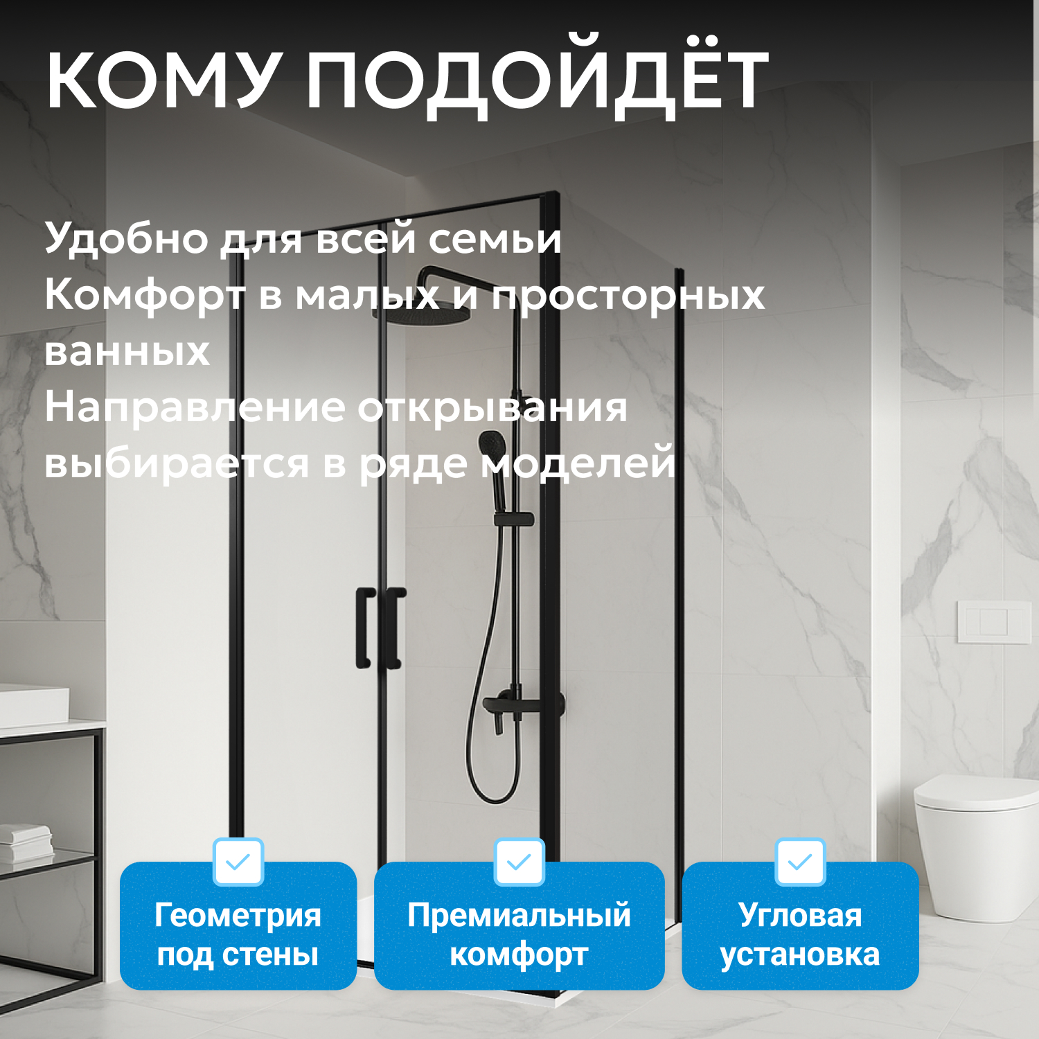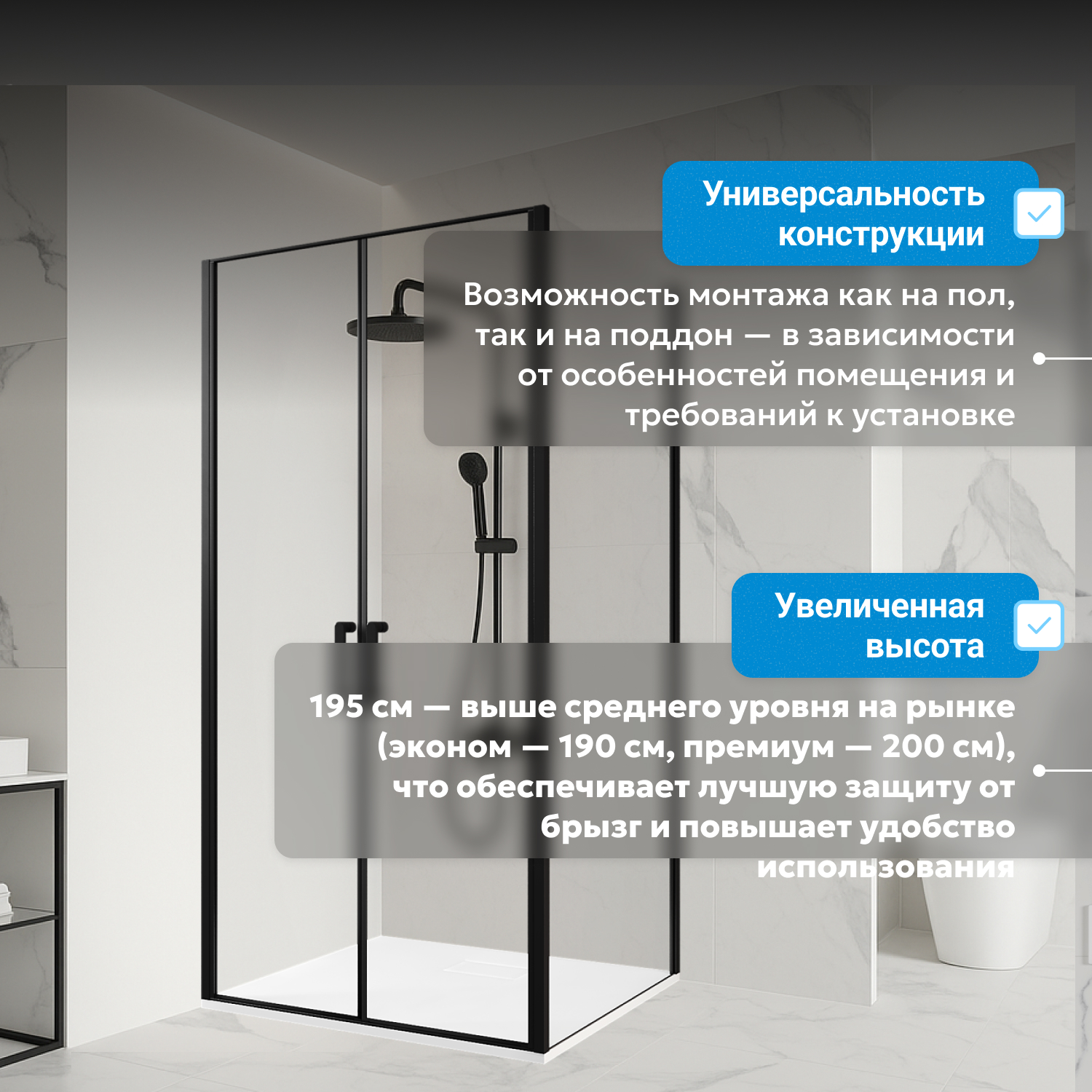Две распашные двери на маятниковых петлях открываются как внутрь, так и наружу, что удобно для повседневного использования и ухода. Закалённое прозрачное стекло толщиной 6 мм придает изделию прочность и лёгкость восприятия. Современный черный профиль подчеркивает минималистичный дизайн и сочетается с современной сантехникой.