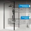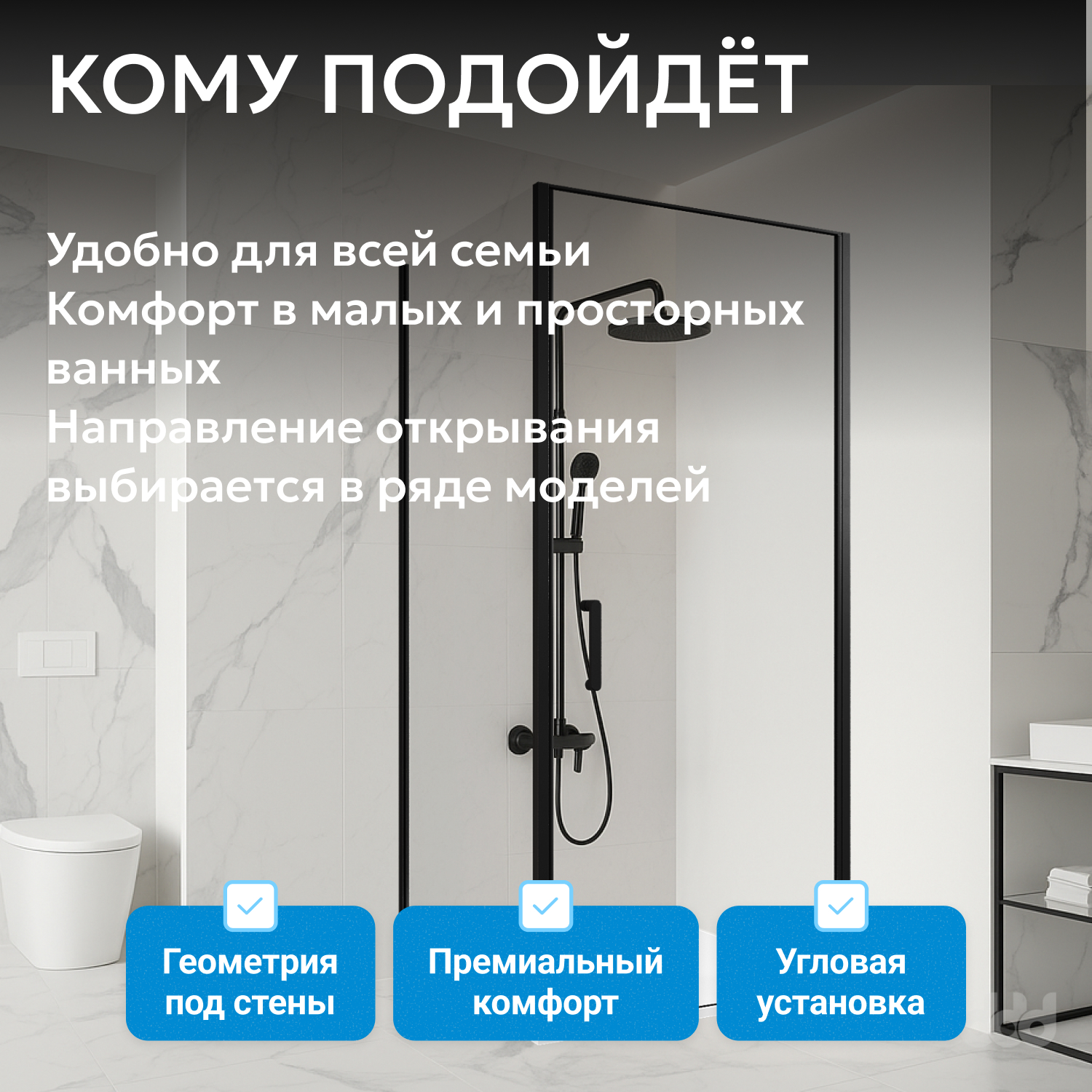 Модель предназначена для установки в угол помещения, что экономит место и подходит для небольших ванных комнат. Вход шириной 895 мм обеспечивает свободный доступ, одна распашная дверь облегчает ежедневное использование. Прозрачное стекло визуально расширяет помещение, эргономичная металлическая ручка и черный профиль подчёркивают минимализм и современный стиль.