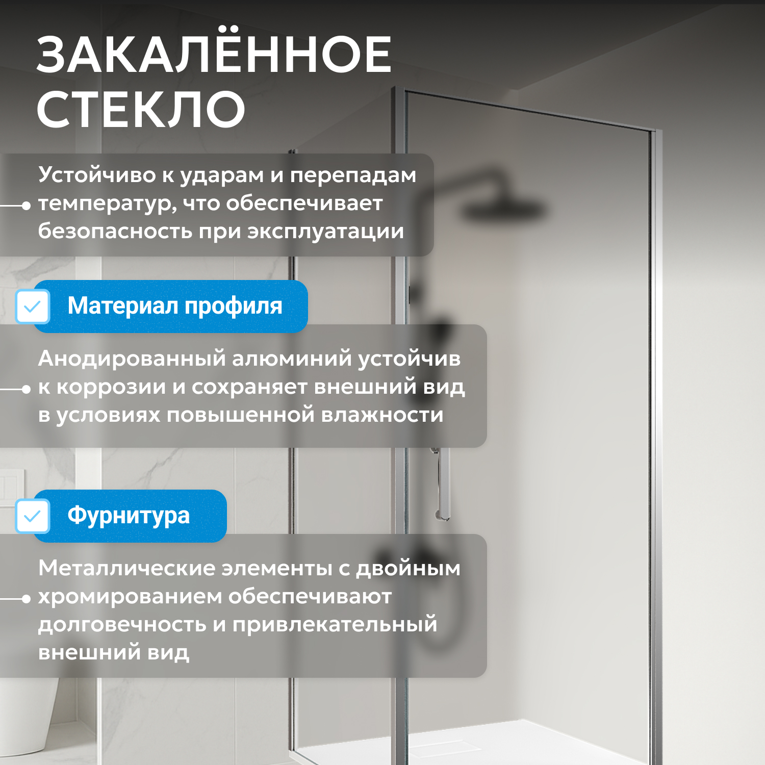 Прямоугольная форма с шириной 70 см и длиной 60 см. Профиль цвета хром гармонирует с разными стилями интерьера. Матовое стекло толщиной 6 мм обеспечивает приватность и безопасность. Распашная дверь на универсальной маятниковой петле открывается внутрь и наружу, упрощая уход и вход (ширина прохода 495 мм).