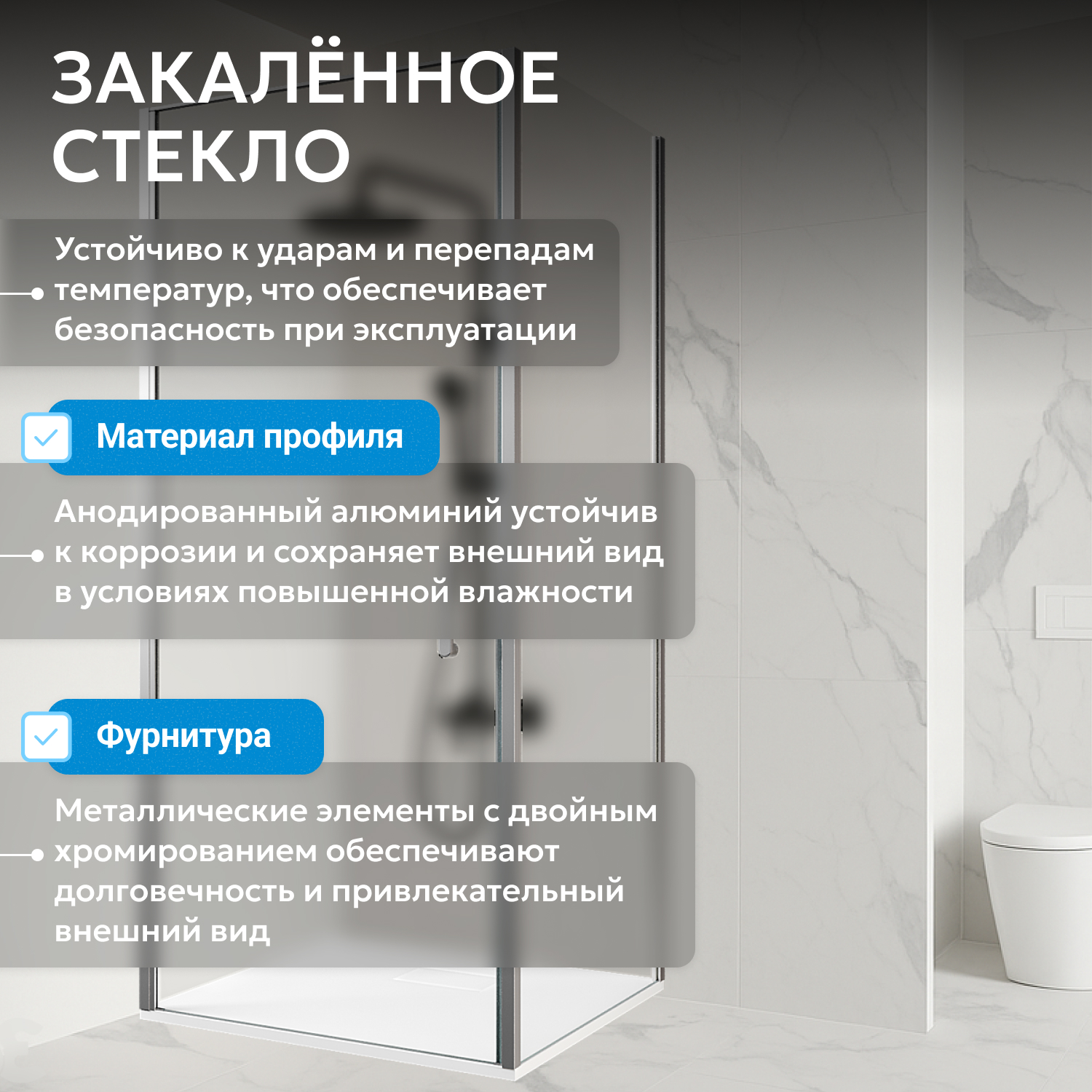 Высота конструкции 195 см, ширина входа 795 мм гарантируют удобство. Маятниковая система петель позволяет открывать двери внутрь и наружу, что удобно для малогабаритных помещений. В комплекте крепкая металлическая ручка, поддон приобретается отдельно для подбора под интерьер.