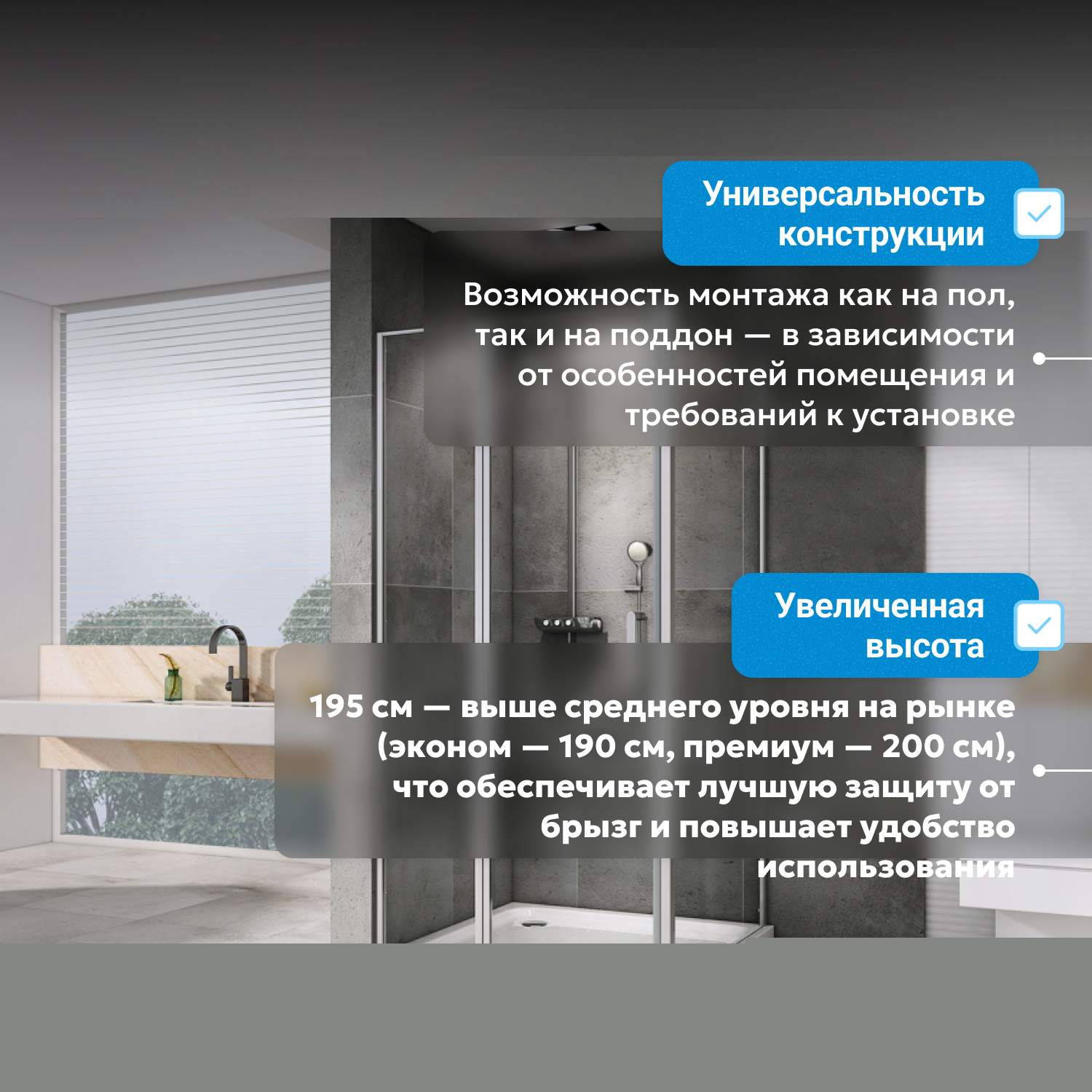 Распашная дверь с металлической ручкой и маятниковой петлей открывается внутрь и наружу, что удобно при ограниченном пространстве. Широкий вход — 754 мм — обеспечивает комфортное использование, высота уголка — 195 см подходит для большинства ванных комнат.