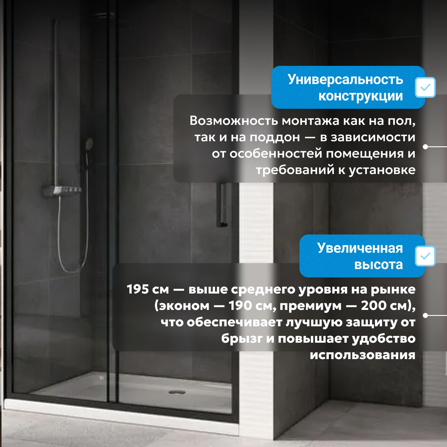 - возможна установка на пол и на поддон, поддон приобретается отдельно