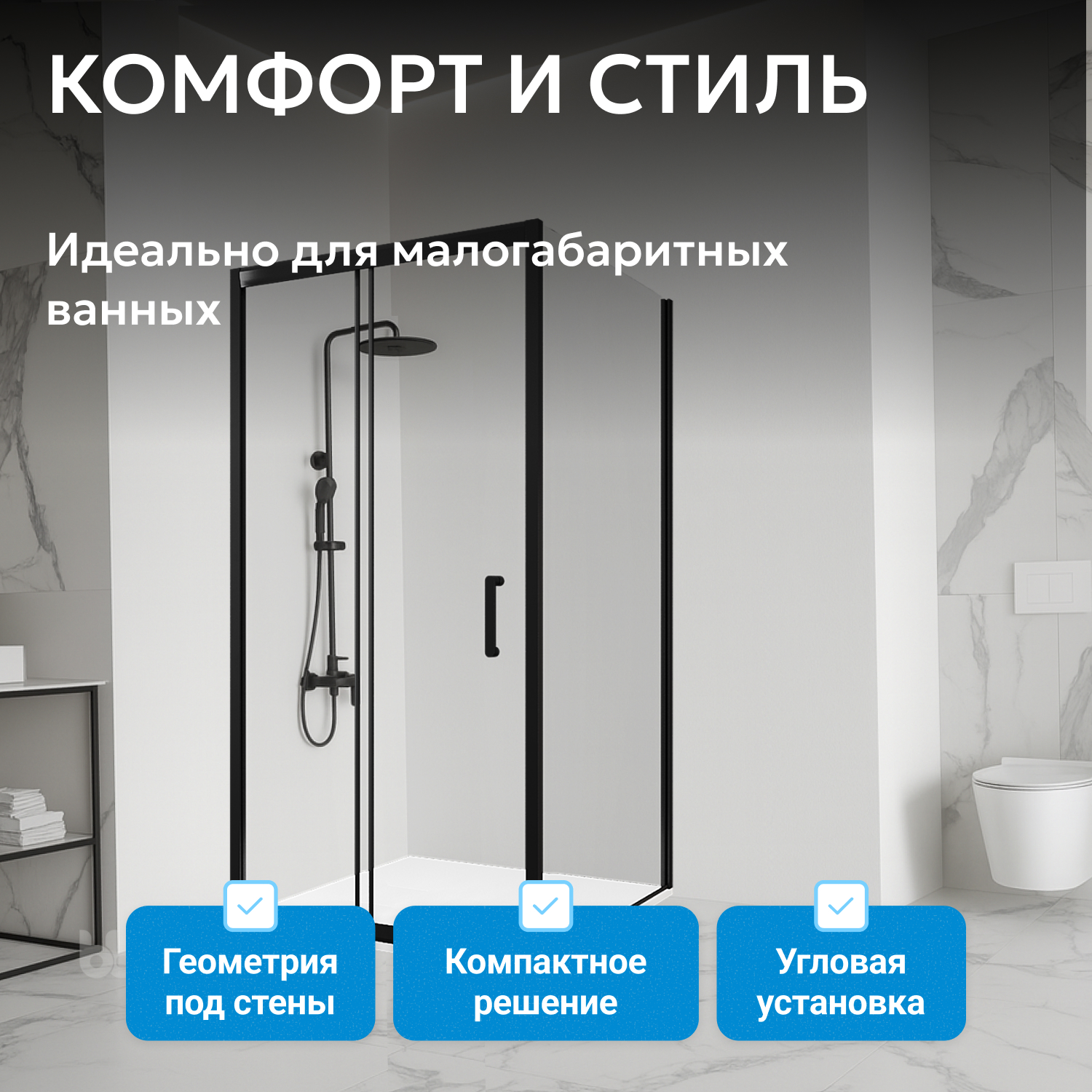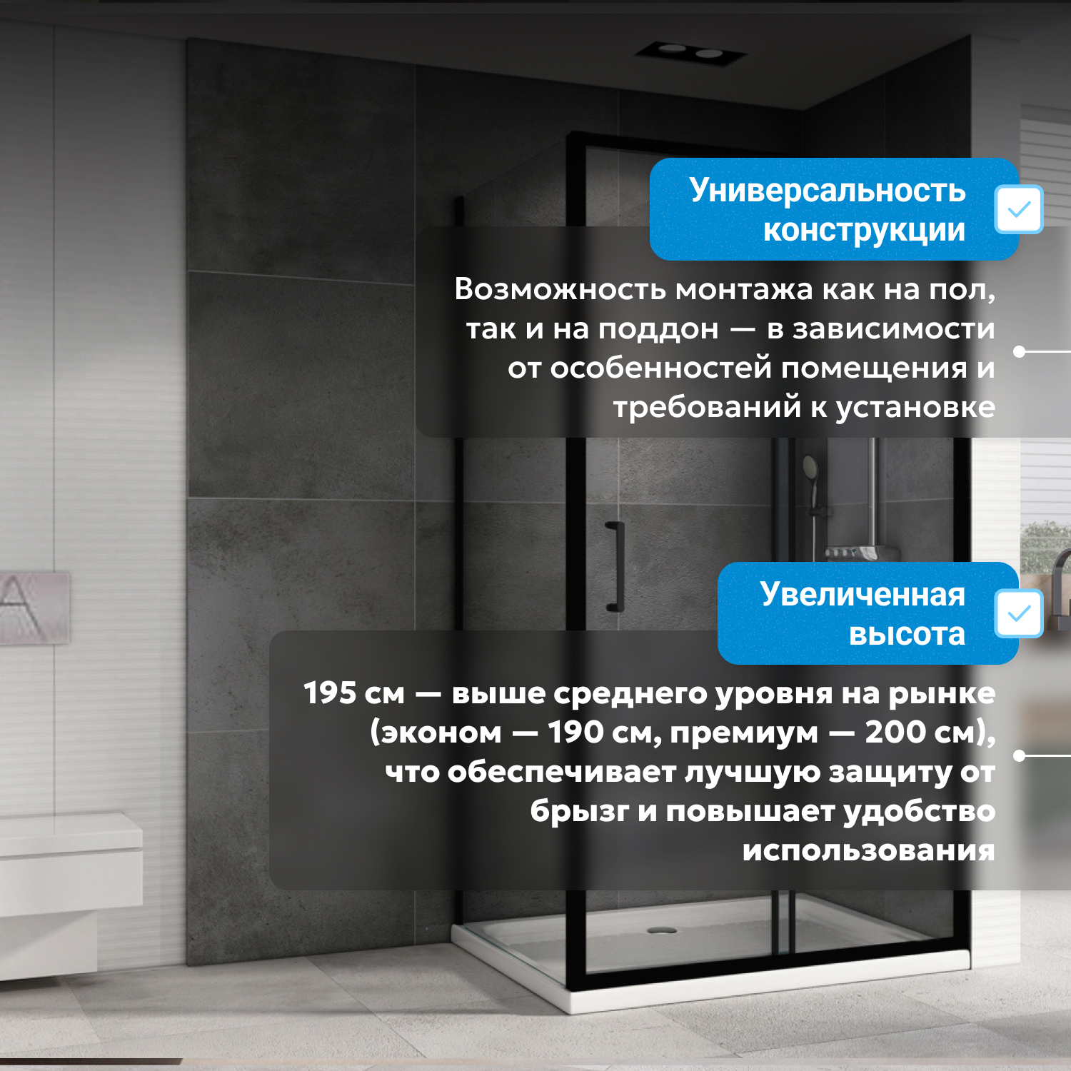 Установка в угол помещения помогает экономить место даже в небольших санузлах. Материалы уголка рассчитаны на интенсивную эксплуатацию, профиль выдерживает вес конструкции около 75 кг. Для монтажа подбирается подходящий низкий поддон (приобретается отдельно), что позволяет индивидуально завершить душевую зону.