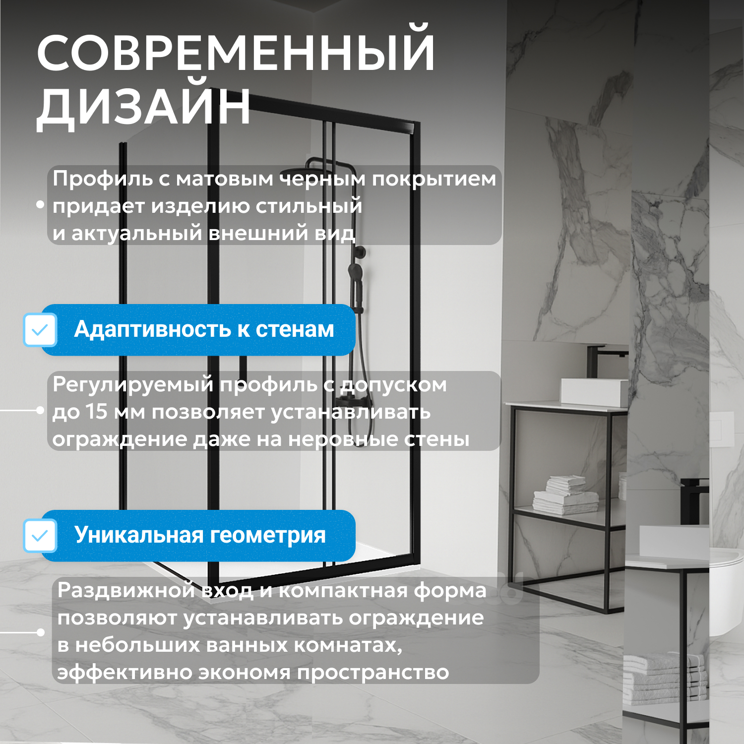 Монтаж выполняется в угол помещения, совместима с низкими поддонами, приобретаемыми отдельно — это позволяет подобрать вариант по размеру и стилю ванной комнаты.