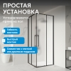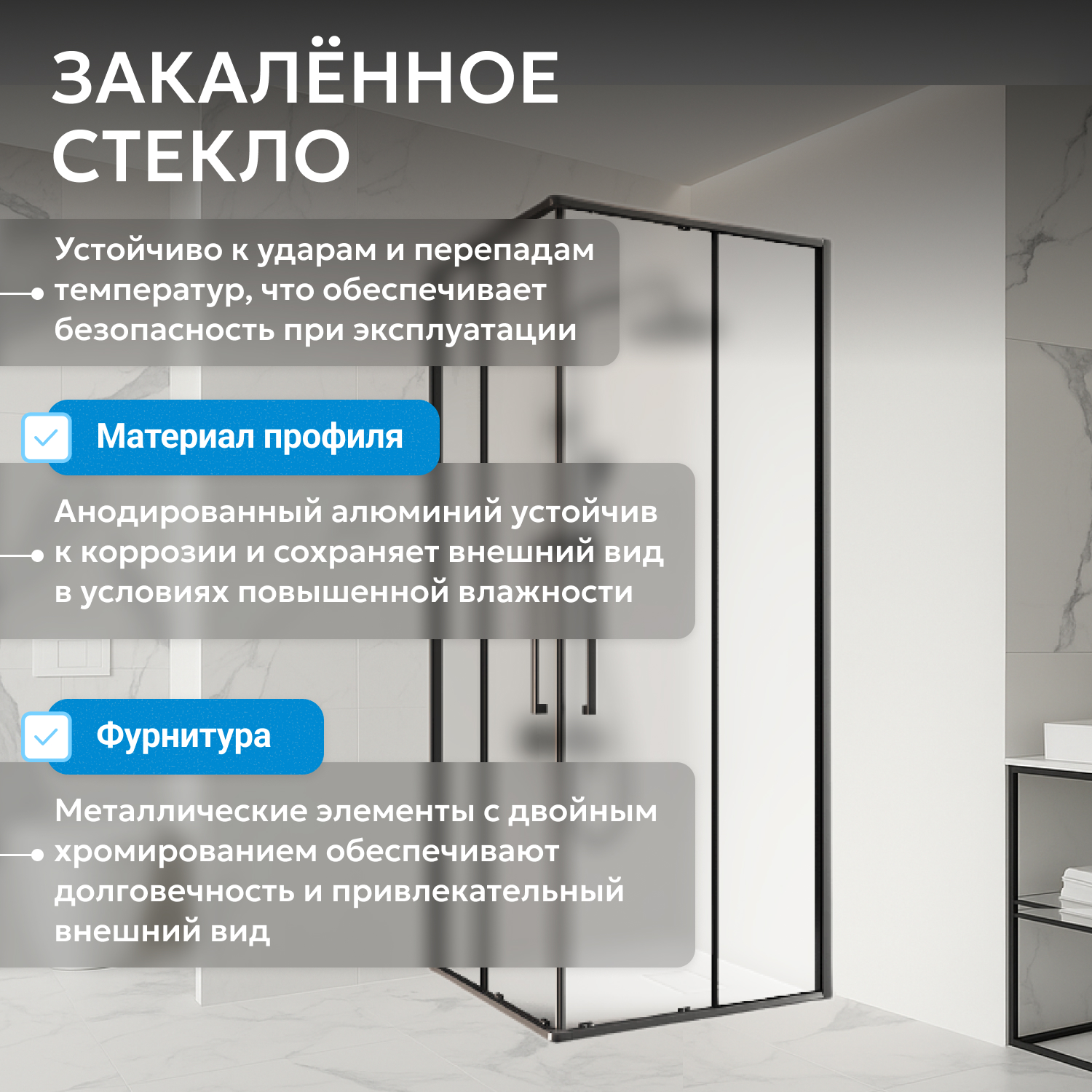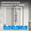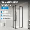 Уголок выполнен из матового закалённого стекла толщиной 6 мм, устойчивого к перепадам температуры и механическим воздействиям. Профиль окрашен в чёрный цвет, что соответствует современным интерьерным решениям. Металлические ручки и двойные ролики обеспечивают плавное и бесшумное скольжение дверей.