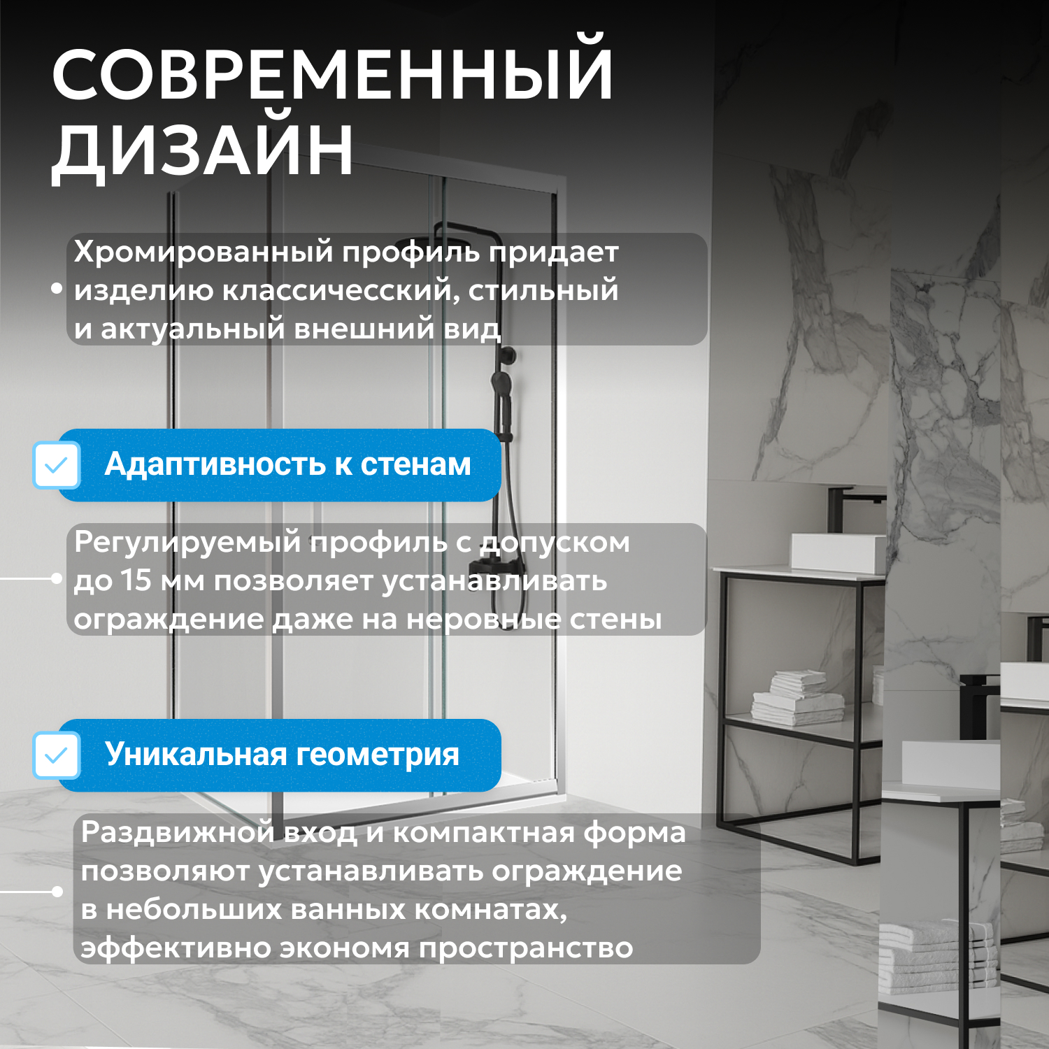 Роликовая система обеспечивает плавное движение двери, а пластиковая ручка рассчитана на долгий срок службы. Стекло легко очищается стандартными средствами. Ширина входа 444 мм обеспечивает удобство эксплуатации, высота 1900 мм подходит людям разного роста.