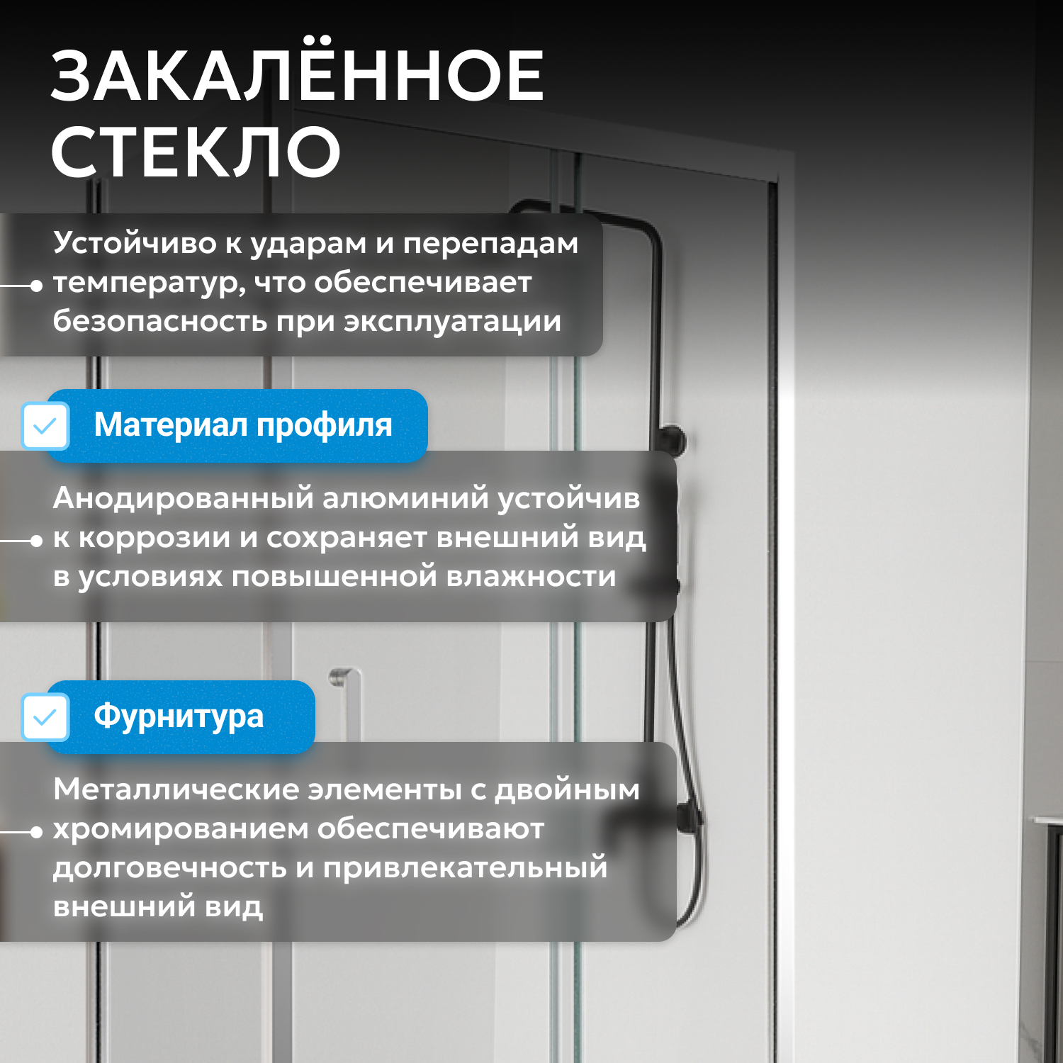 Угловой монтаж экономит пространство и способствует удобной планировке. Раздвижная дверь с системой двойных роликов обеспечивает плавное и тихое открытие, пластиковая ручка практична в эксплуатации.