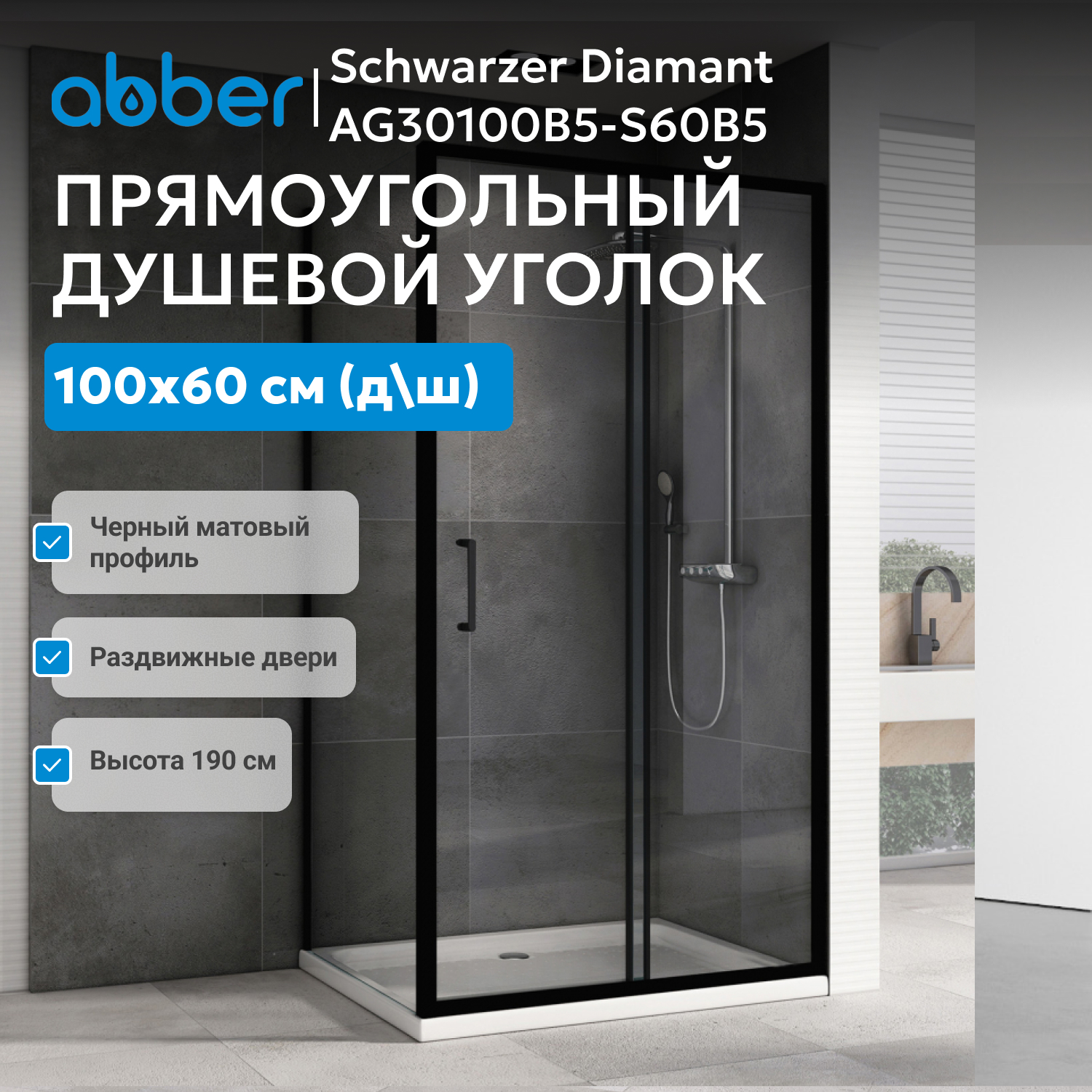 Душевой уголок ABBER Schwarzer Diamant AG30100B5-S60B5 — решение для душевого пространства в жилых и коммерческих помещениях. Прямоугольная форма и универсальный формат обеспечивают совместимость с большинством современных ванных комнат, а строгий черный профиль соответствует современным тенденциям в дизайне интерьеров.