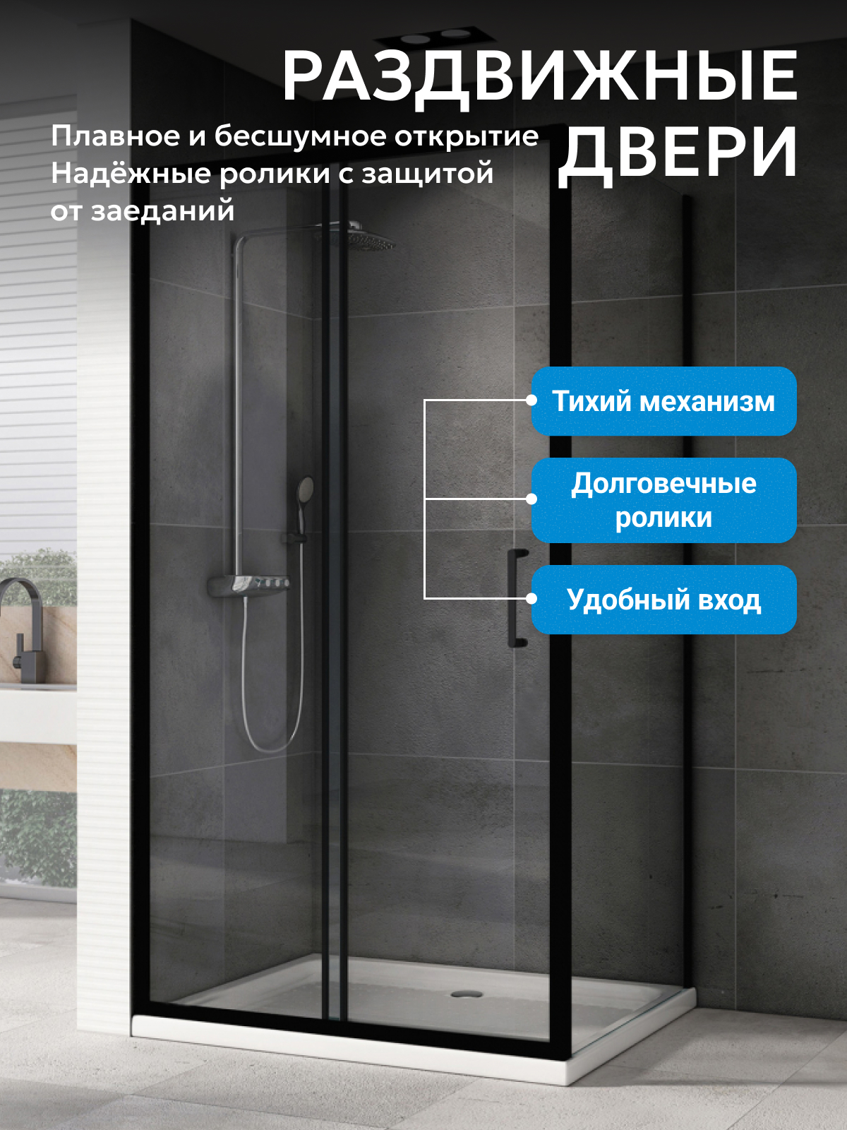 Раздвижная дверь на двойных роликах обеспечивает плавный ход при ежедневном пользовании. Пластиковая ручка снижает риск коррозии и упрощает сервис. Одна дверь минимизирует разбрызгивание воды, ширина входа 494 мм удобна для пользователей любого возраста.