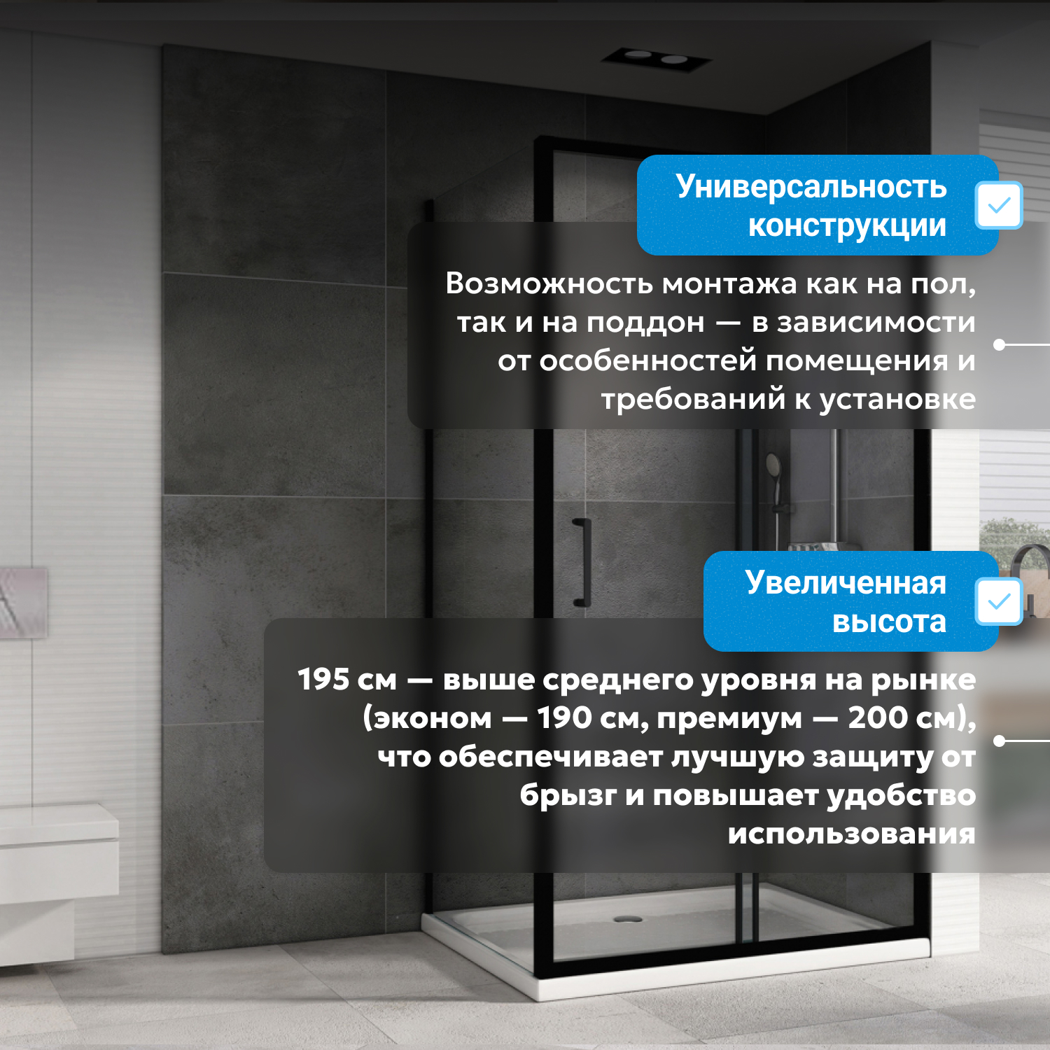 Модель оснащена раздвижной дверью на двойных роликах, что облегчает открывание и закрывание, обеспечивая долговечность механизма. Пластиковая ручка устойчива к влаге и удобна в ежедневном использовании. Ширина входа 494 мм предоставляет комфортный проход. Монтаж производится в угол, что помогает экономить пространство, актуально для небольших ванных комнат.