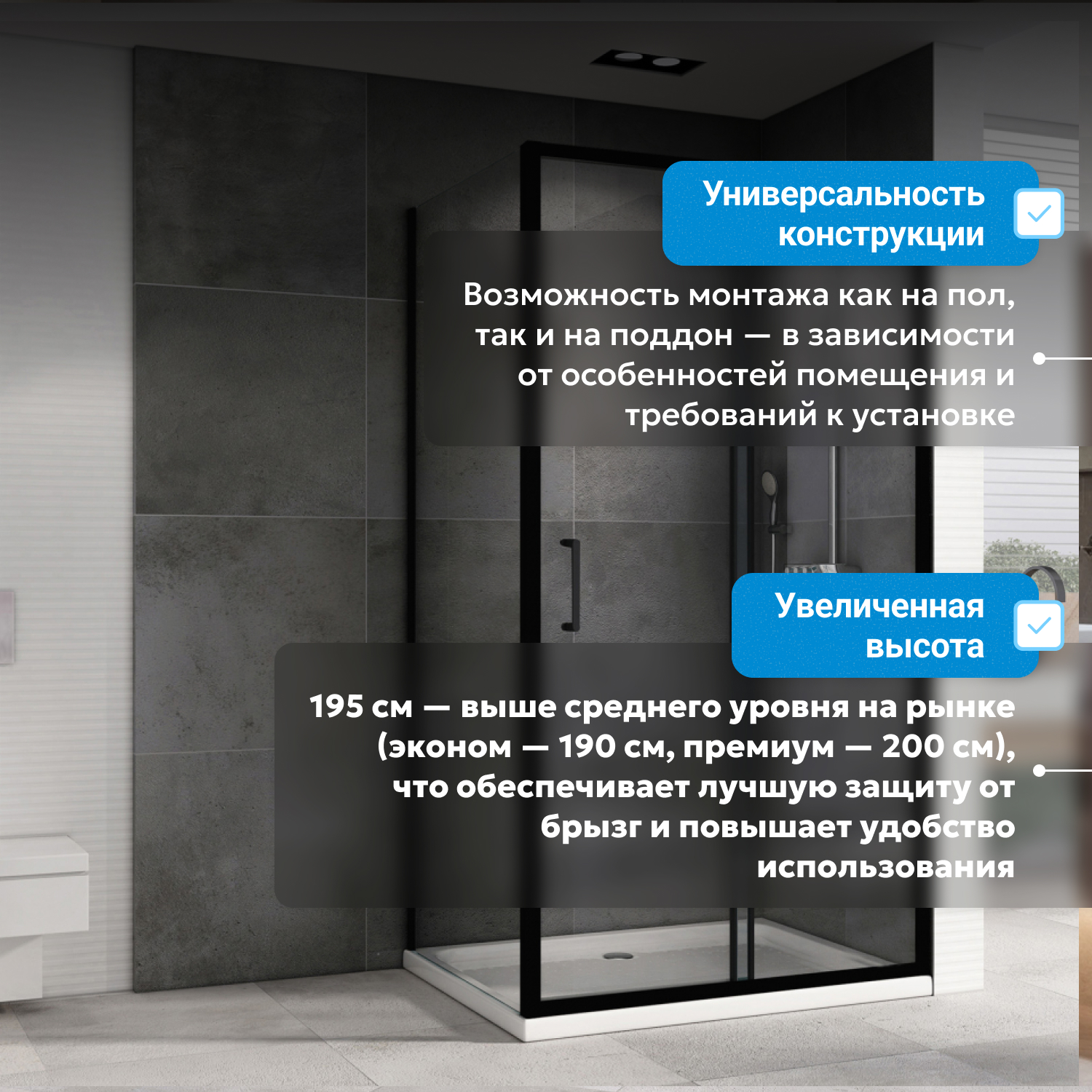 Черный профиль каркаса гармонично вписывается в современные интерьеры. Раздвижная дверь экономит пространство, ширина входа 644 мм удобна для прохода. Двойные ролики способствуют плавному ходу, пластиковая ручка практична для ежедневного использования. Конструкция предназначена для углового монтажа, выбор низкого поддона возможен по предпочтению.