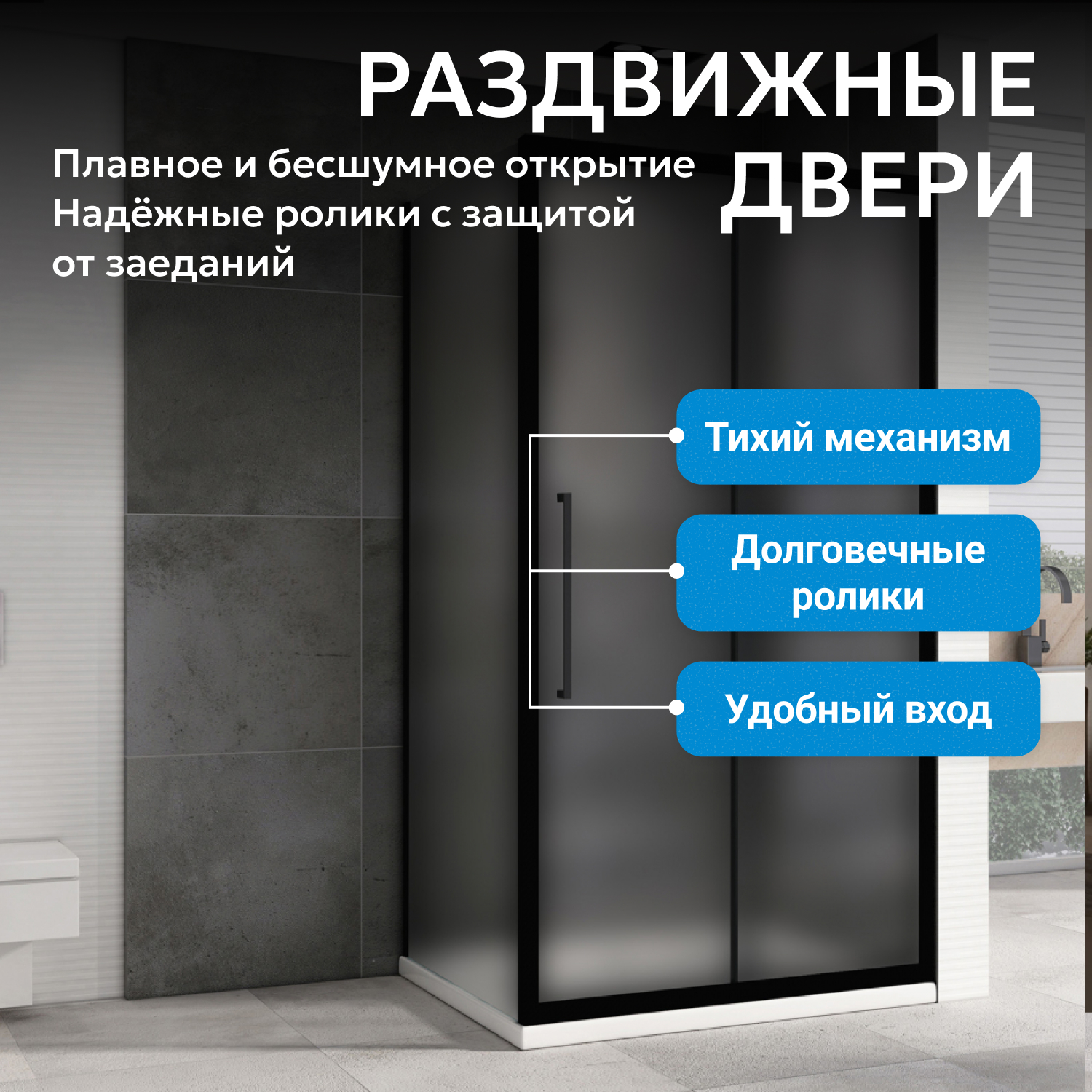 Коллекция Schwarzer Diamant сочетает оригинальный дизайн с функциональностью и безопасностью. Матовое закаленное стекло 6 мм прочное, защищает от повреждений и скрывает внутреннее пространство. Одна раздвижная дверь с двойными роликами обеспечивает плавность открывания. Металлические ручки устойчивы к коррозии и сохраняют эстетичность изделия.