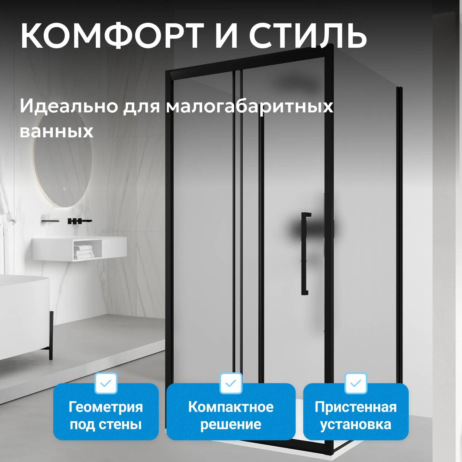Каркас изготовлен из прочного металла с черным матовым профилем, который подчеркивает современный интерьер. Матовое закаленное стекло толщиной 6 мм обеспечивает приватность и облегчает уход. Раздвижная дверь оснащена надежной металлической ручкой. Душевой уголок устанавливается с низким поддоном (приобретается отдельно), что позволяет подобрать вариант под размеры помещения.