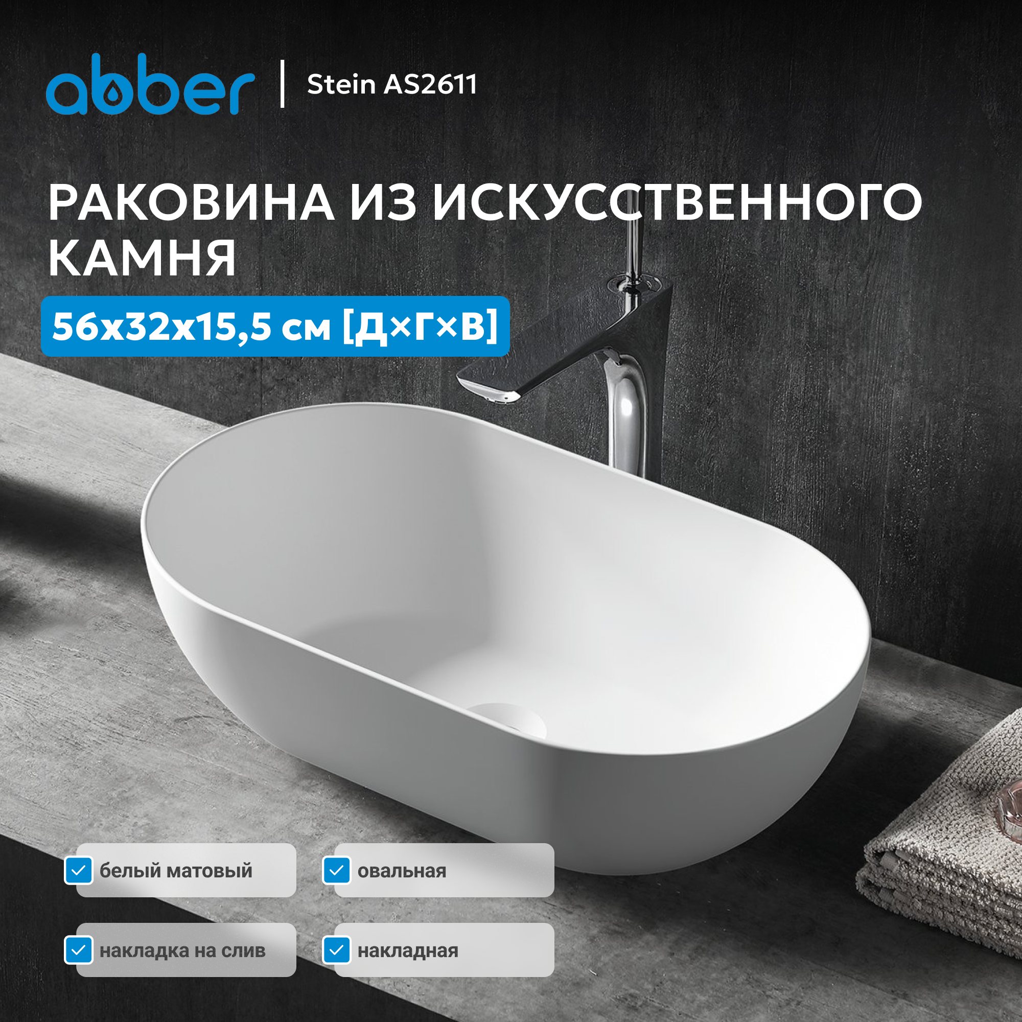 Раковина накладная ABBER Stein AS2611 белая матовая