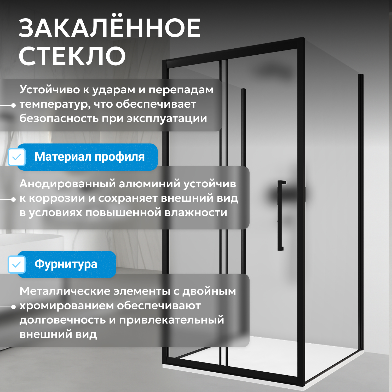 Каркас черного цвета подчеркивает строгий дизайн коллекции Schwarzer Diamant. Матовое закалённое стекло толщиной 6 мм обеспечивает прочность и устойчивость к механическим воздействиям. Ширина входа 498 мм удобна для пользователей различной комплекции. Раздвижная дверь на двойных роликах плавно открывается и экономит пространство. Металлические ручки делают использование изделия комфортным.