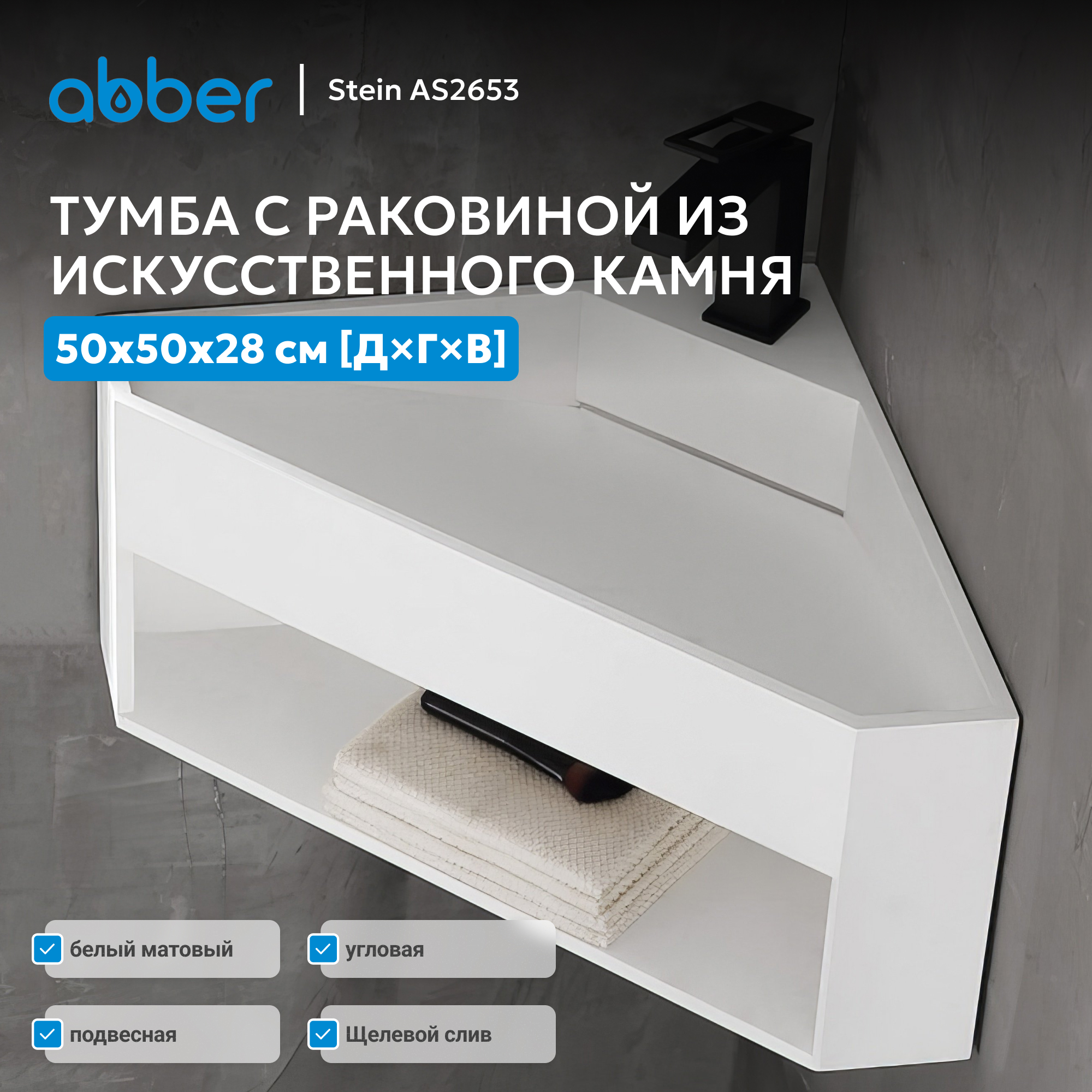 Тумба с раковиной ABBER Stein AS2653 подвесная, угловая, белая матовая