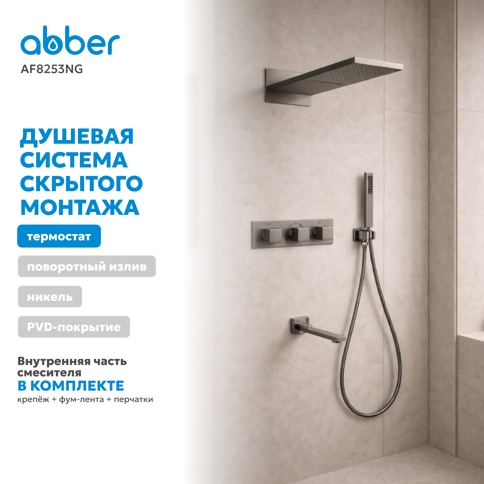 Душевые системы скрытого монтажа / Душевая система ABBER Daheim AF8253NG скрытого монтажа с изливом, с термостатом, оружейная сталь