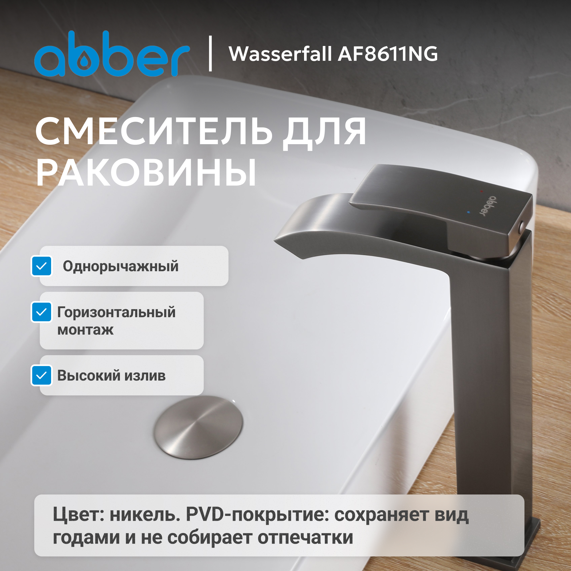 Смеситель ABBER Wasserfall AF8611NG для накладной раковины, никель