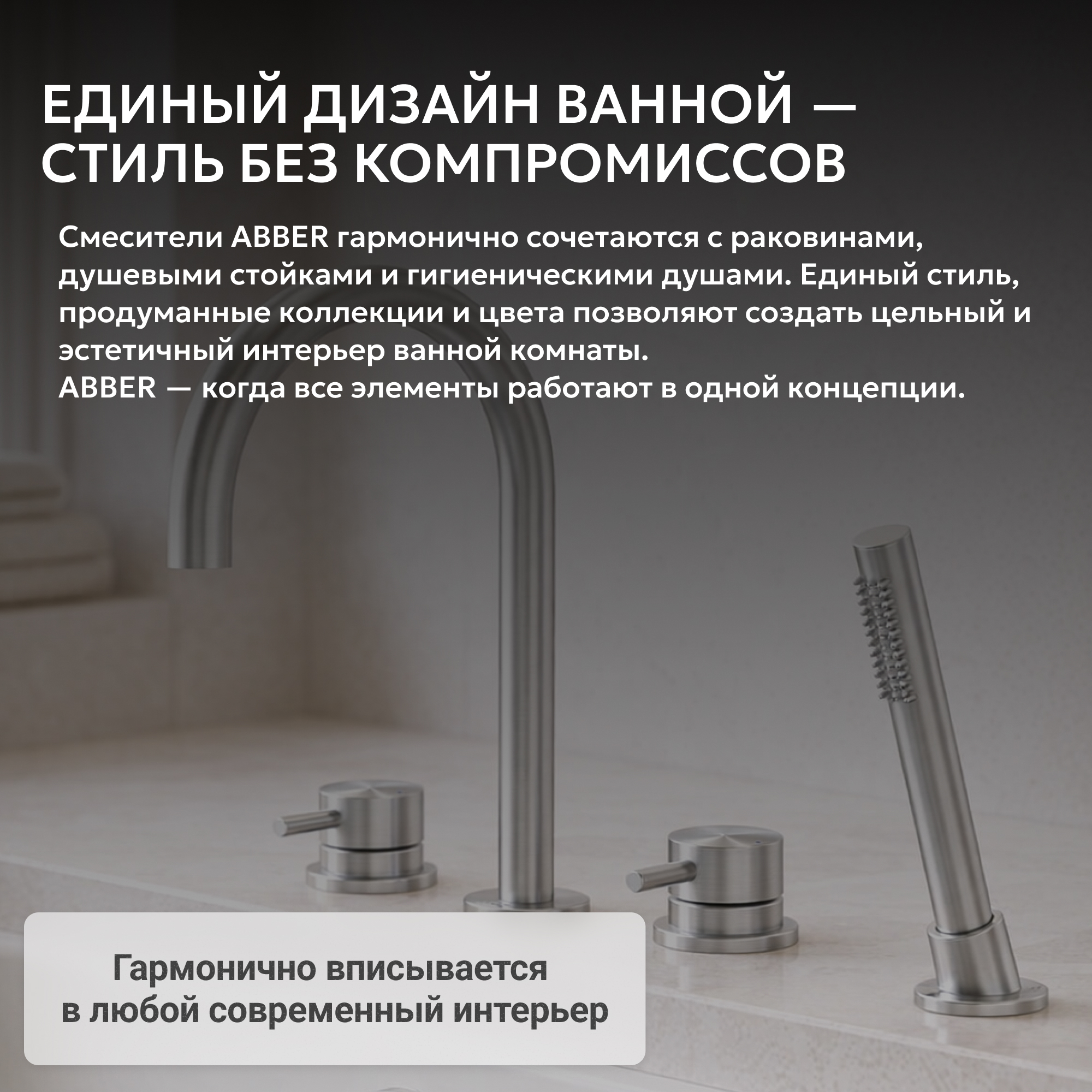 Благодаря уникальным свойствам нержавеющей стали, мы смогли создать совершенно новые коллекции смесителей ABBER в которых сочетается ультрасовременный внешний вид и высокие эксплуатационные характеристики. Эти изделия не только удивляют своим дизайном, но и обеспечивают долговечность и надежность в эксплуатации. Мы рады презентовать эти уникальные изделия, которые вдохновляют на создание удивительных интерьеров. Они подходят для любых стилей и направлений, от минимализма до классики, и способны преобразить любое пространство. Наши коллекции вносят нотку инновации и элегантности в повседневную жизнь, даря удобство и комфорт каждому пользователю.