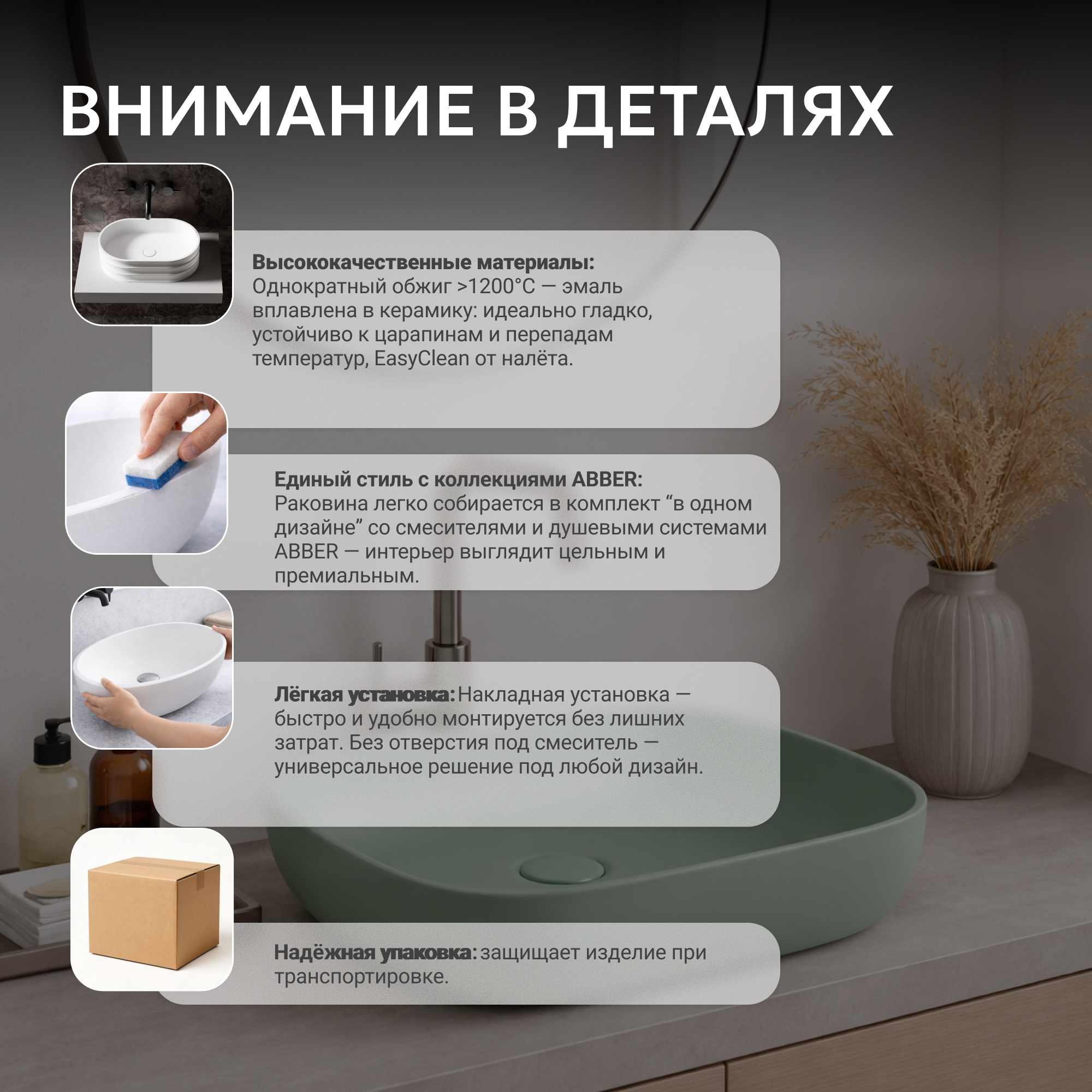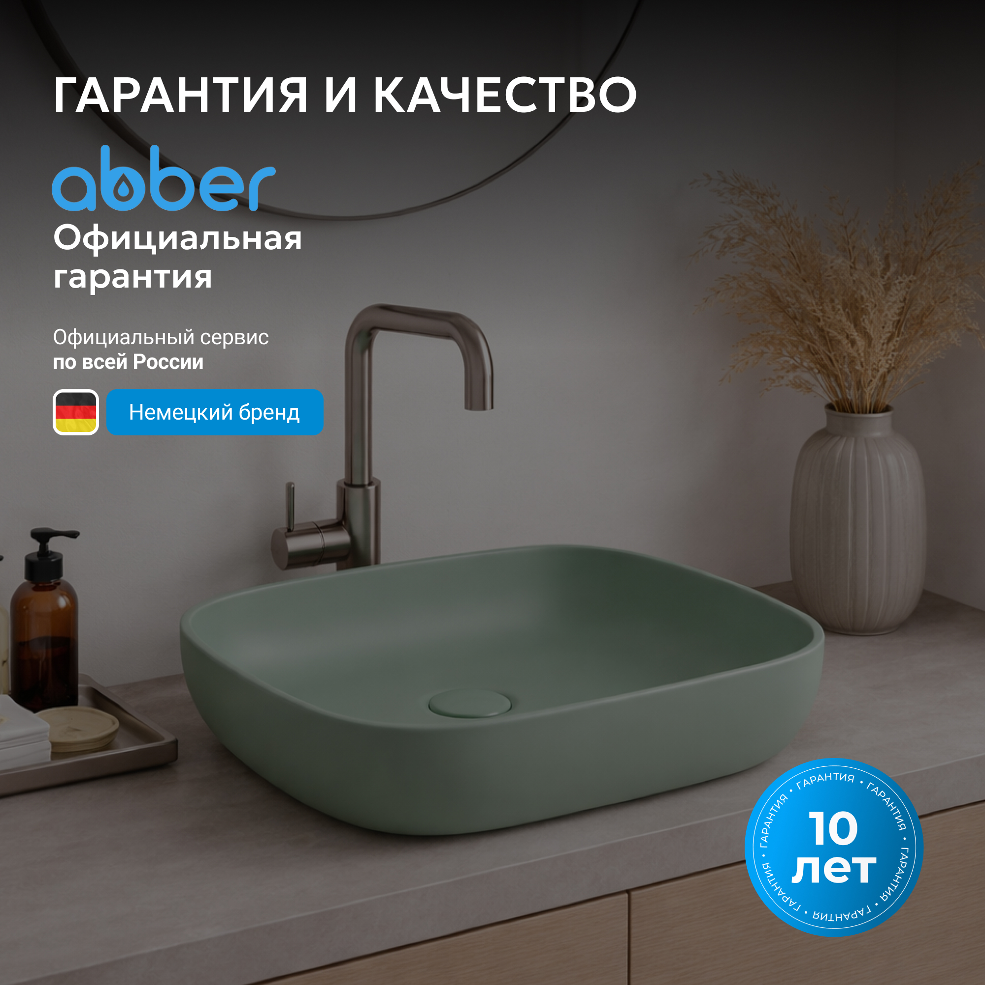 Раковины ABBER изготавливаются по уникальной технологии однократного высокотемпературного обжига керамики в печи (температура свыше 1200°С). Эмаль при таком процессе вплавляется в структуру керамики, образуя прочную идеально гладкую поверхность устойчивую к царапинам с эффектом EasyClean - защита от загрязнений и известкового налета.