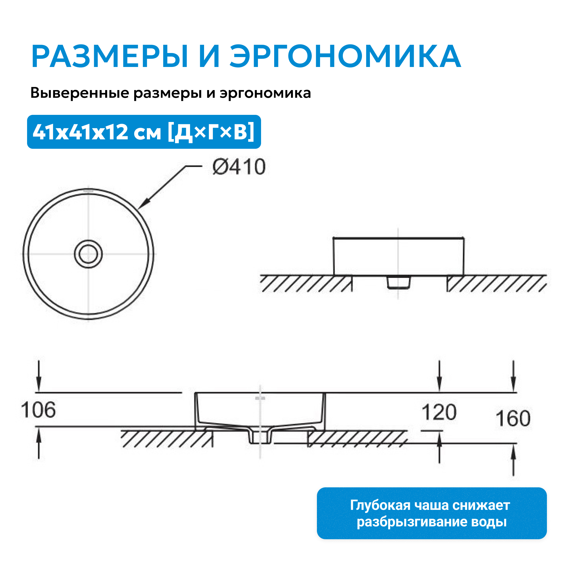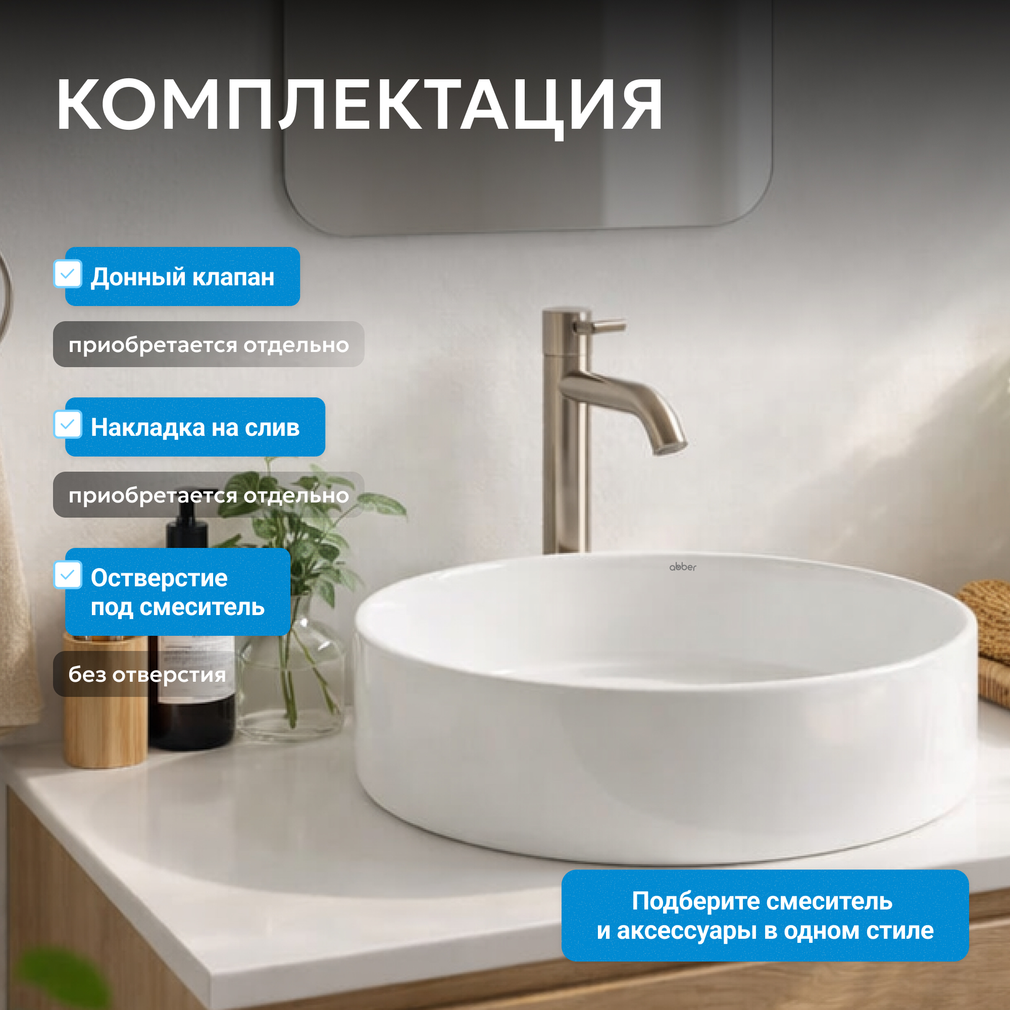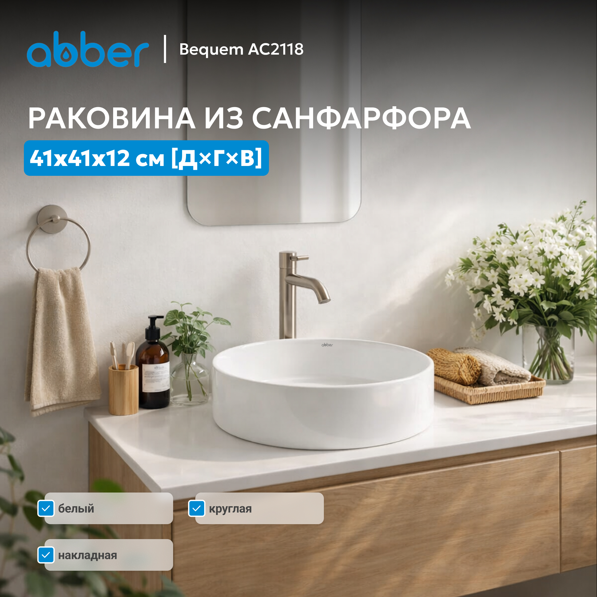 - накладные раковины ABBER можно установить на столешницу, тумбу, консоль