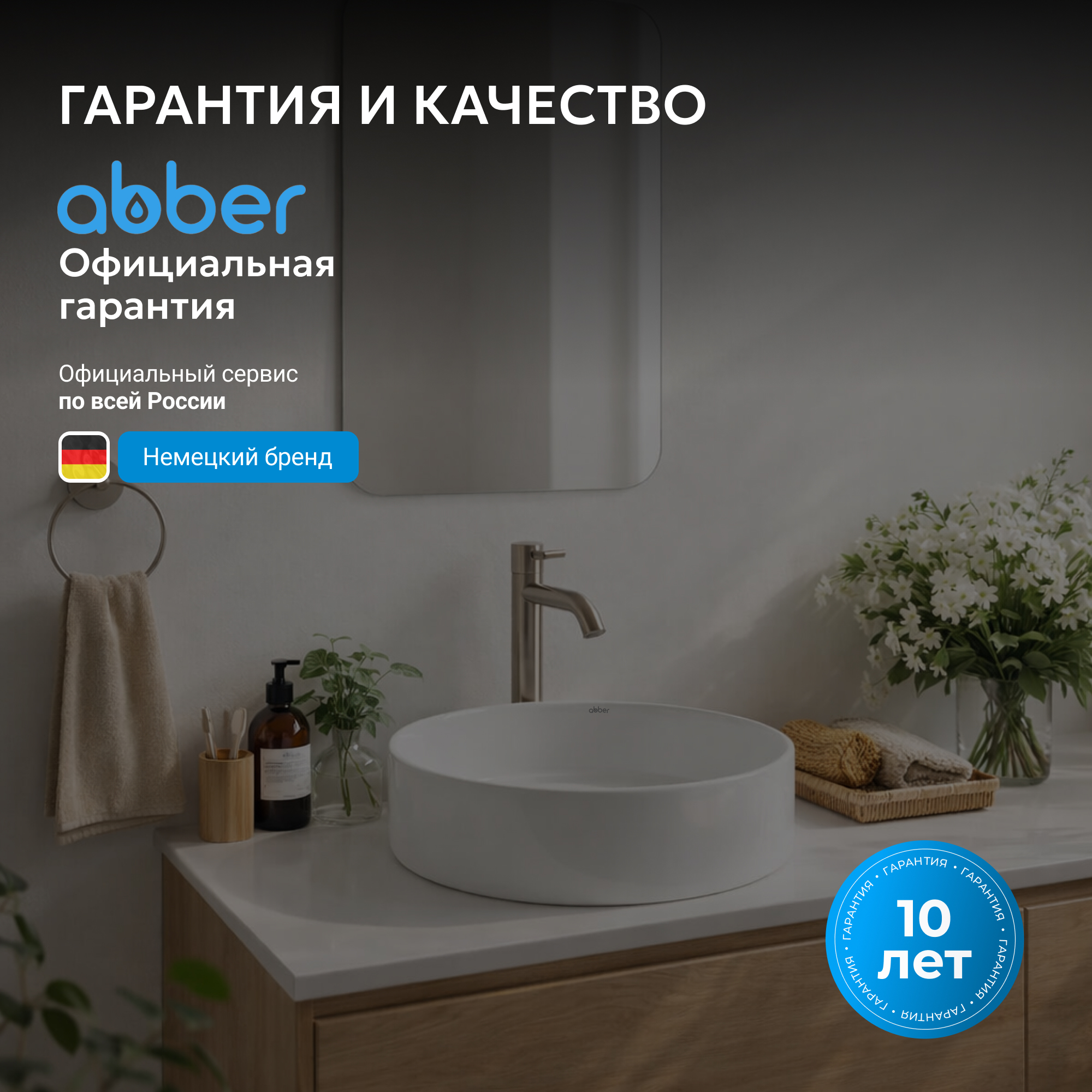 Раковины ABBER изготавливаются по уникальной технологии однократного высокотемпературного обжига керамики в печи (температура свыше 1200°С). Эмаль при таком процессе вплавляется в структуру керамики, образуя прочную идеально гладкую поверхность устойчивую к царапинам с эффектом EasyClean - защита от загрязнений и известкового налета.