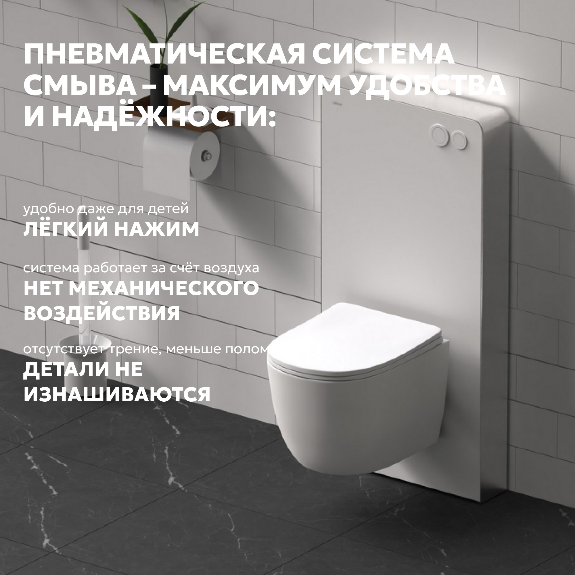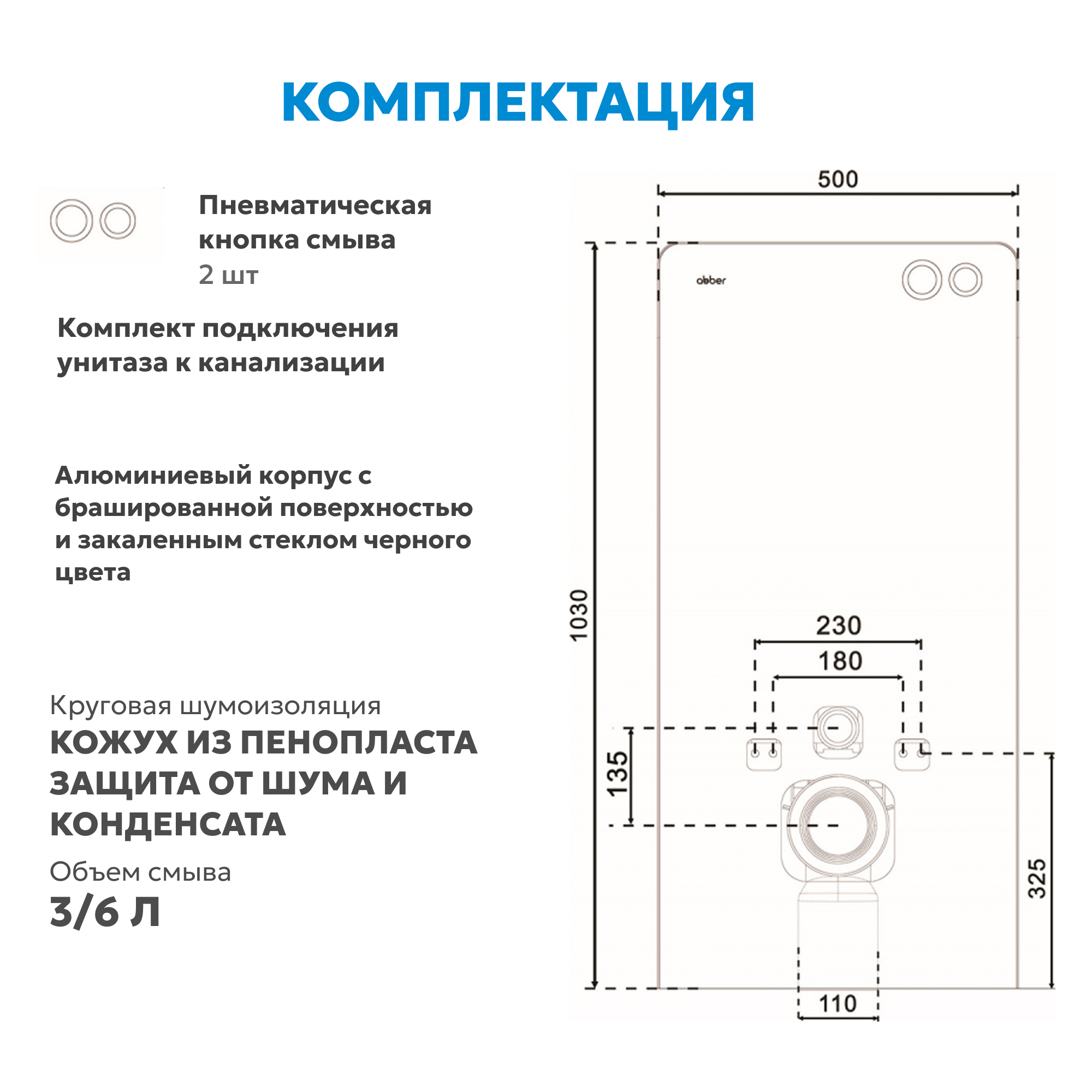 - Двухрежимный смыв с пневматическими клавишами, 3 и 6 литров.