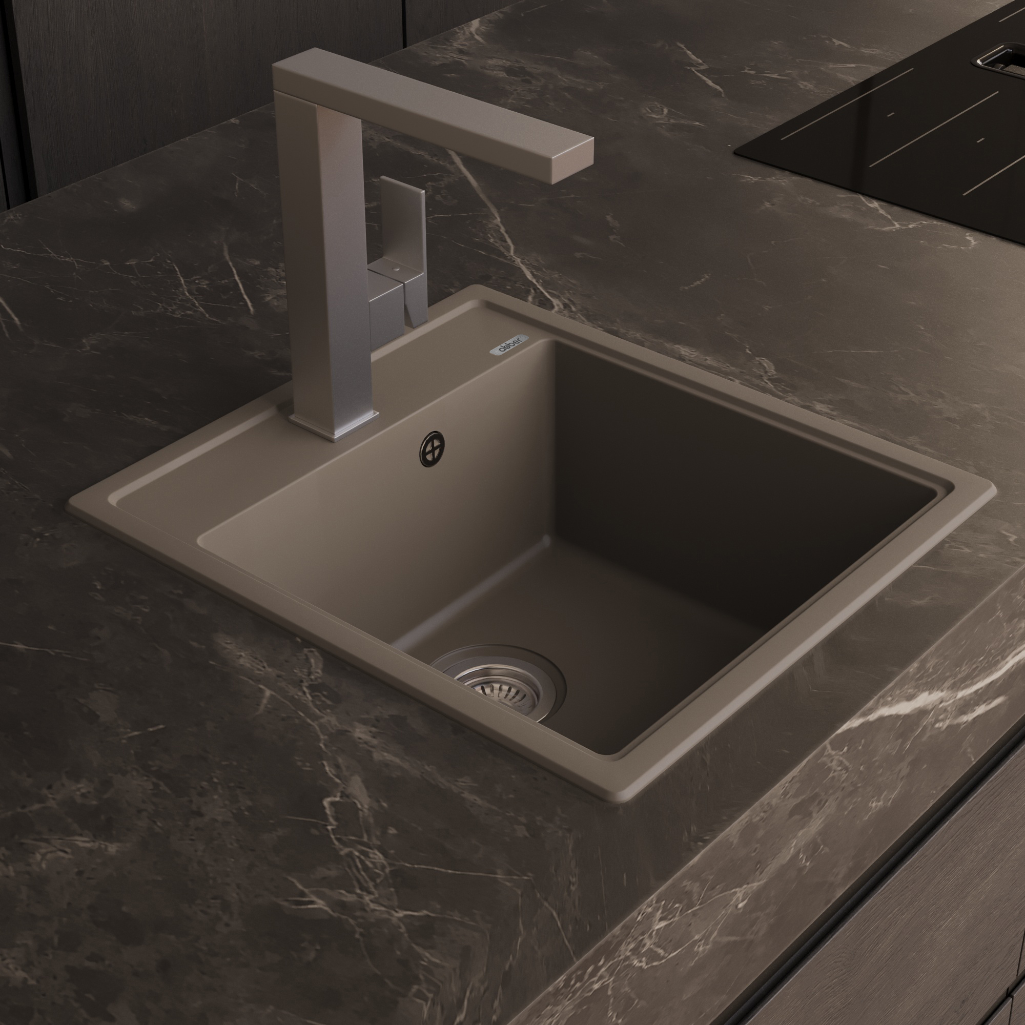 Кухонные мойки ABBER из кварцевого композита — это долговечность, надежность и простота в уходе. Серая кварцевая мойка 46х51х21,7см органично сочетается с любым стилем, от модерна до классики. Вы можете выбрать мойку с крылом или без. Чтобы очистить мойку, не нужно использовать какие-то специализированные средства. Кварцевая мойка не боится повреждений, не окрашиваются продуктами. Как натуральный камень, но лучше и дешевле!