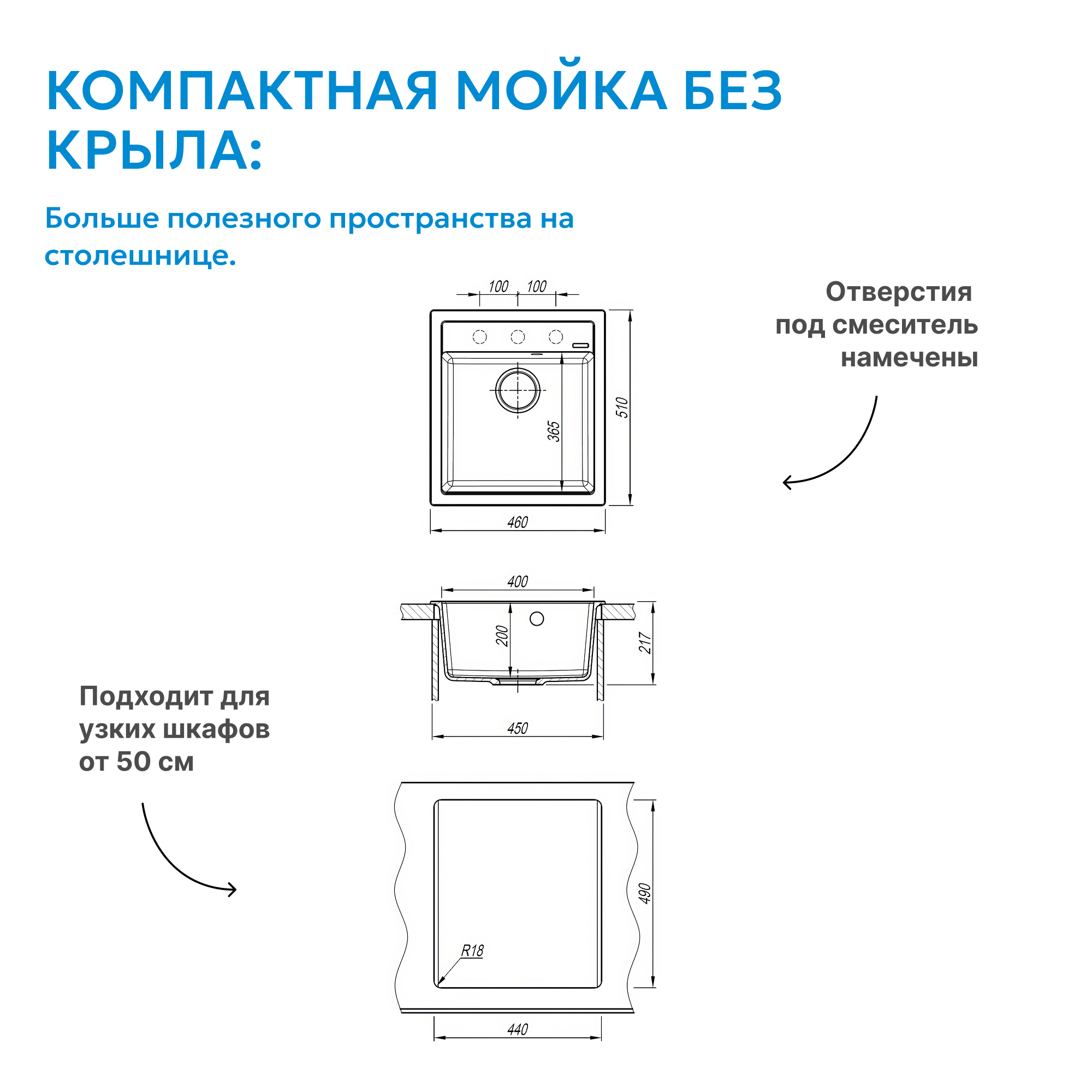 - Удобство монтажа — предусмотрено намеченное отверстие под смеситель, что облегчает установку и позволяет выбрать оптимальное положение.