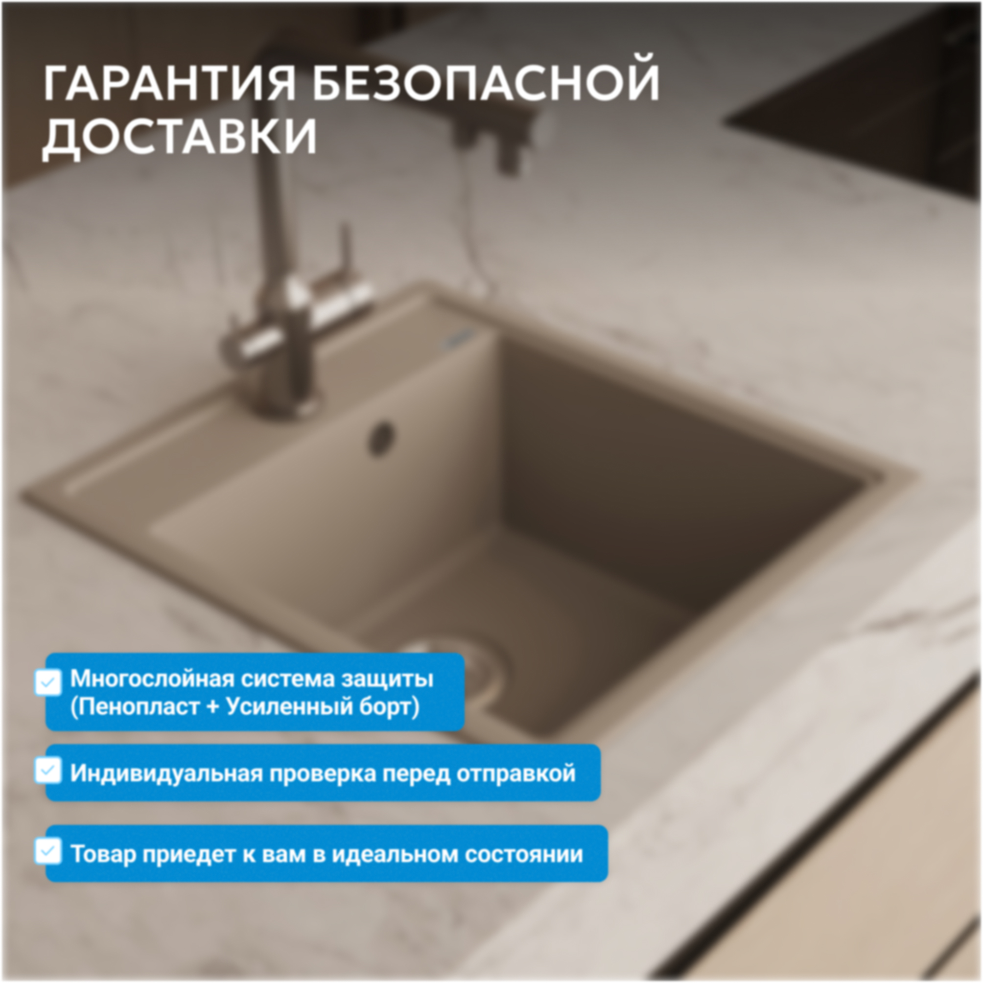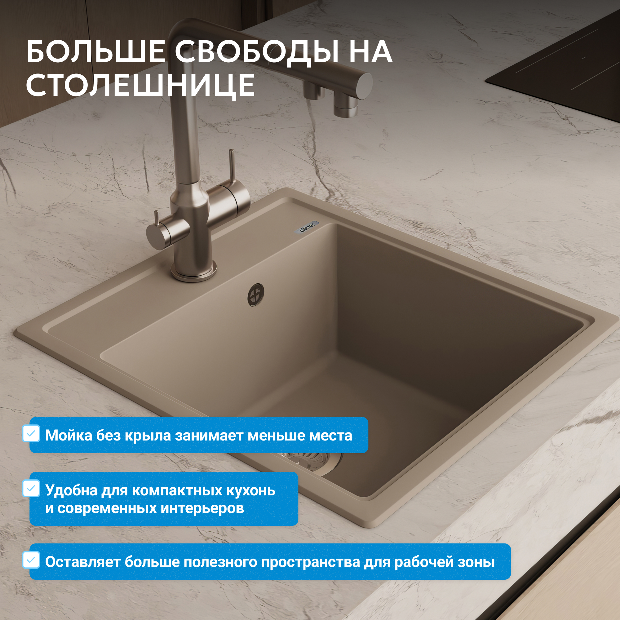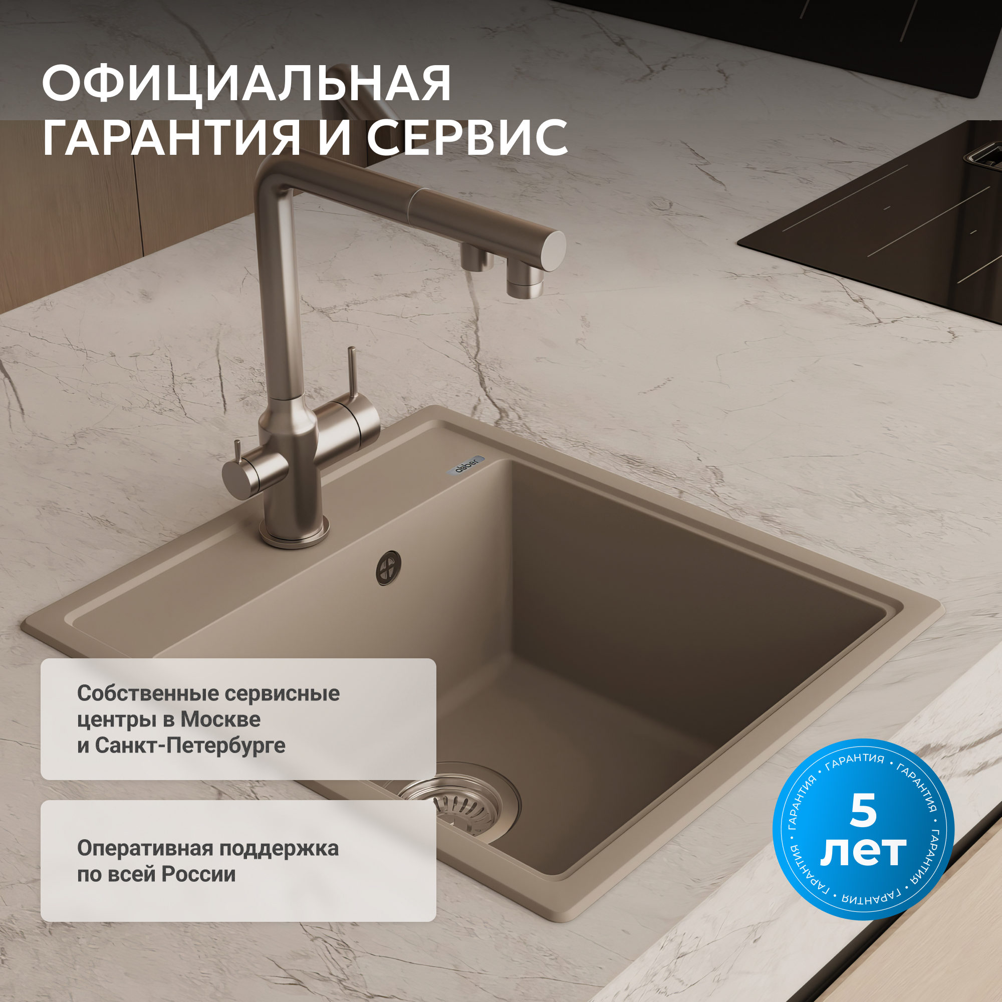 Кухонные мойки ABBER из кварцевого композита — это долговечность, надежность и простота в уходе. Лаконичный, сбалансированный дизайн Песочной кварцевой мойки 46х51х21,7см и ее натуральный цвет подойдет почти к любому стилю кухни. Вы можете выбрать мойку с крылом или без. Чтобы очистить мойку, не нужно использовать какие-то специализированные средства. Кварцевая мойка не боится повреждений, не окрашиваются продуктами. Как натуральный камень, но лучше и дешевле!