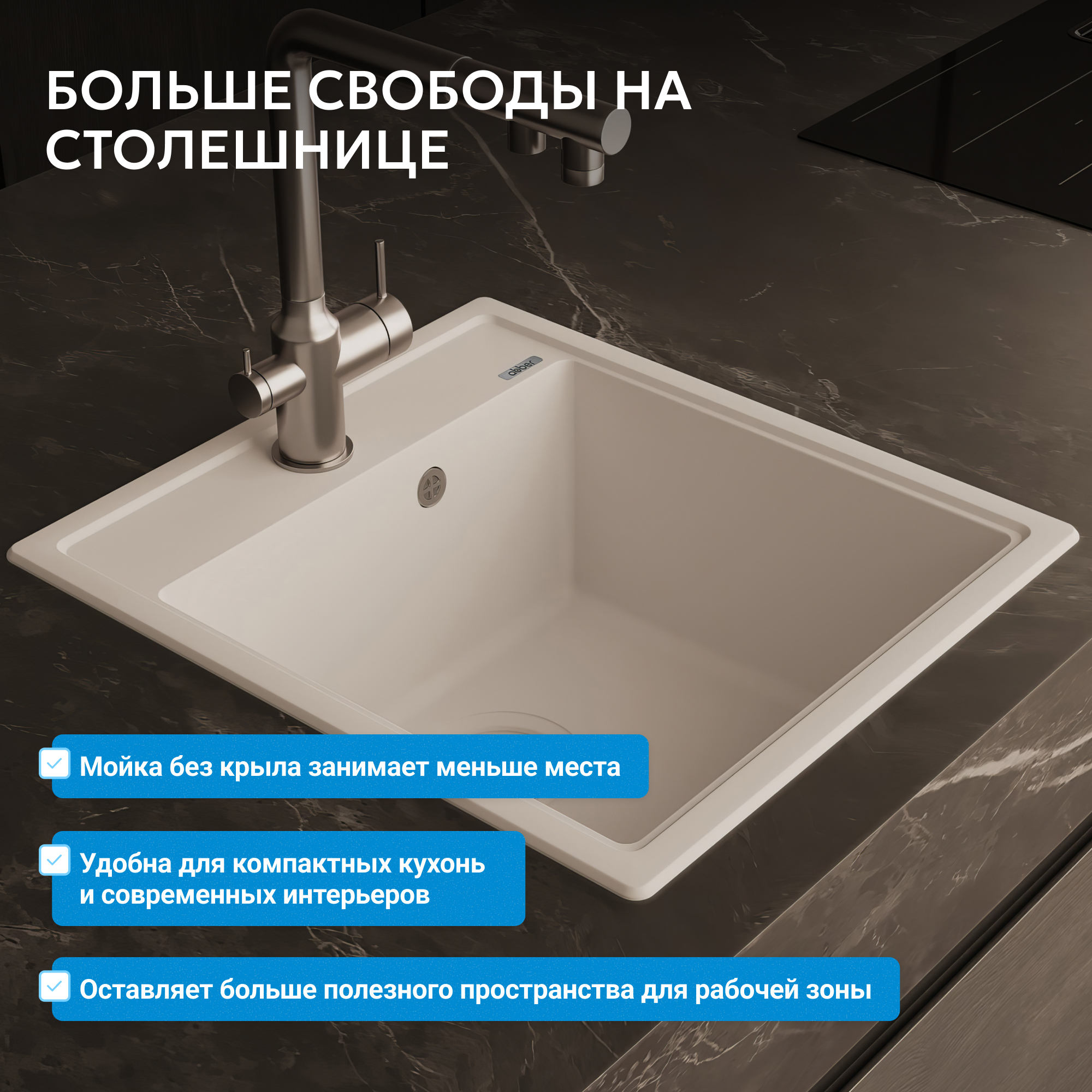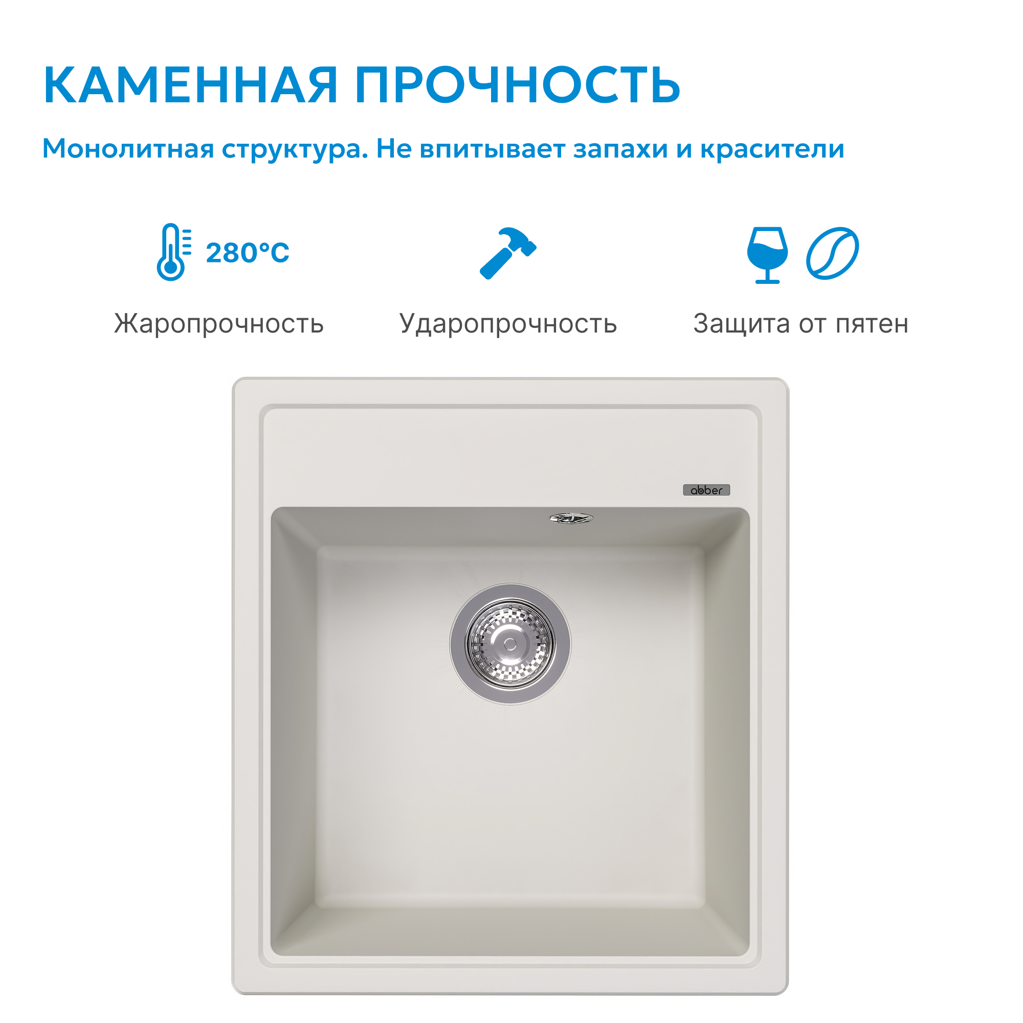 Кухонные мойки ABBER из кварцевого композита — это долговечность, надежность и простота в уходе. Белая кварцевая мойка 46х51х21,7см — неизменная и неустаревающая классика. Вы можете выбрать мойку с крылом или без. Чтобы очистить мойку, не нужно использовать какие-то специализированные средства. Кварцевая мойка не боится повреждений, не окрашиваются продуктами. Как натуральный камень, но лучше и дешевле!