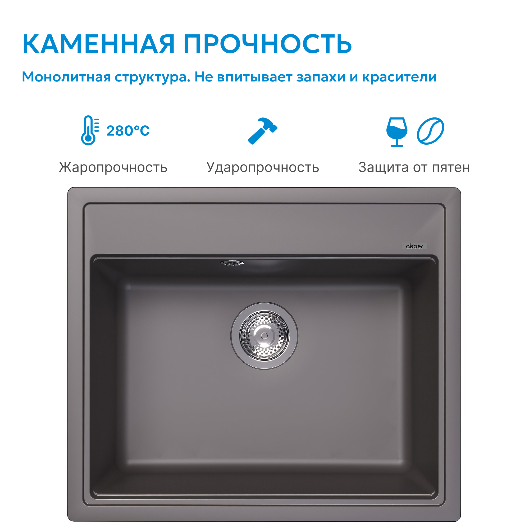 Кухонные мойки ABBER из кварцевого композита — это долговечность, надежность и простота в уходе. Серая кварцевая мойка 60х51х21,7см органично сочетается с любым стилем, от модерна до классики. Вы можете выбрать мойку с крылом или без. Чтобы очистить мойку, не нужно использовать какие-то специализированные средства. Кварцевая мойка не боится повреждений, не окрашиваются продуктами. Как натуральный камень, но лучше и дешевле!