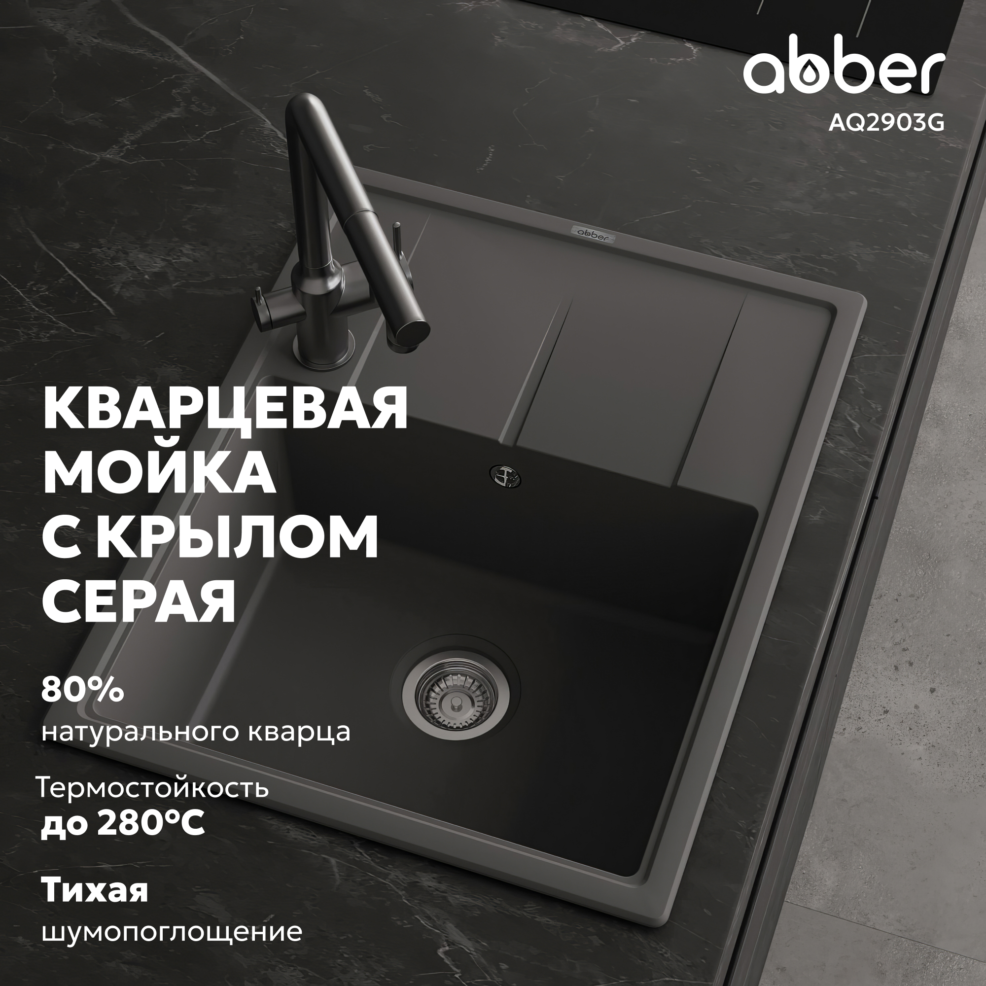 Кухонные мойки ABBER из кварцевого композита — это долговечность, надежность и простота в уходе. Серая кварцевая мойка 65х51х21,7см органично сочетается с любым стилем, от модерна до классики. Вы можете выбрать мойку с крылом или без. Чтобы очистить мойку, не нужно использовать какие-то специализированные средства. Кварцевая мойка не боится повреждений, не окрашиваются продуктами. Как натуральный камень, но лучше и дешевле!