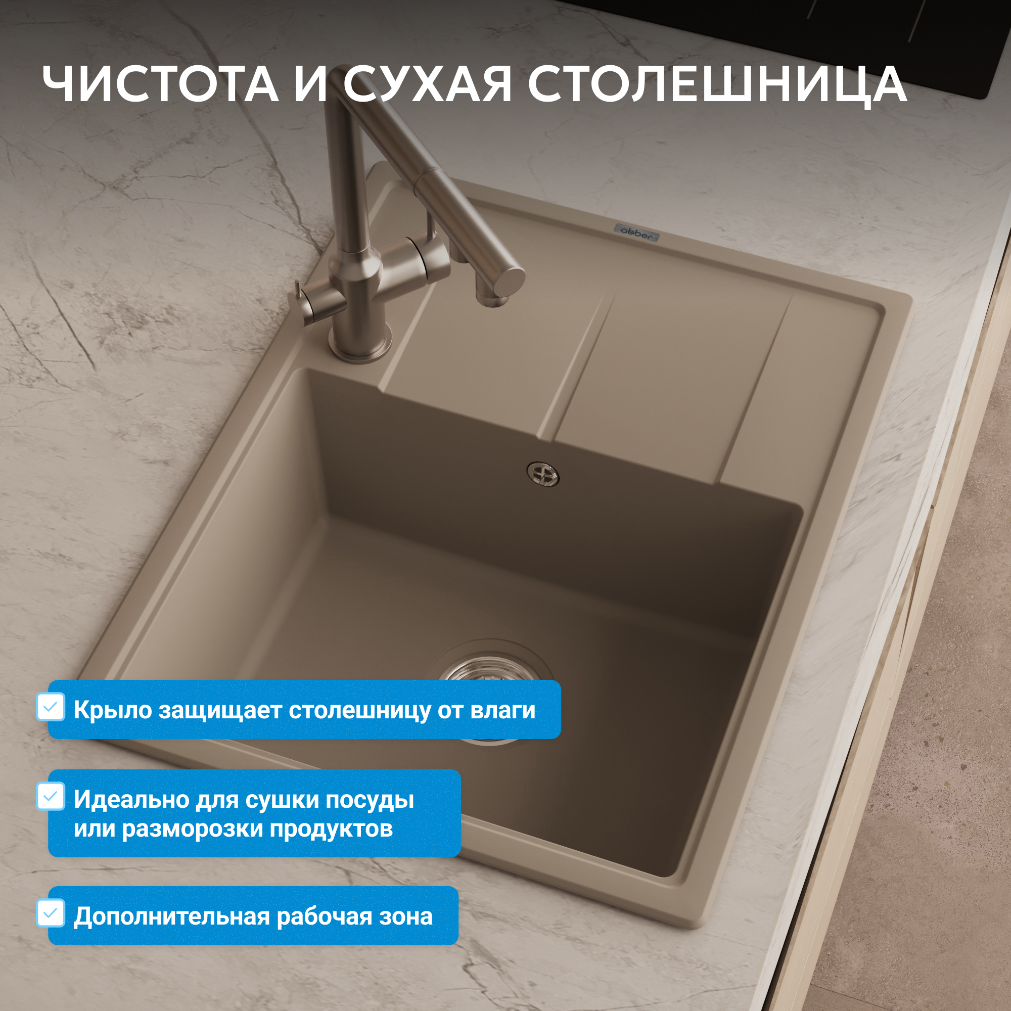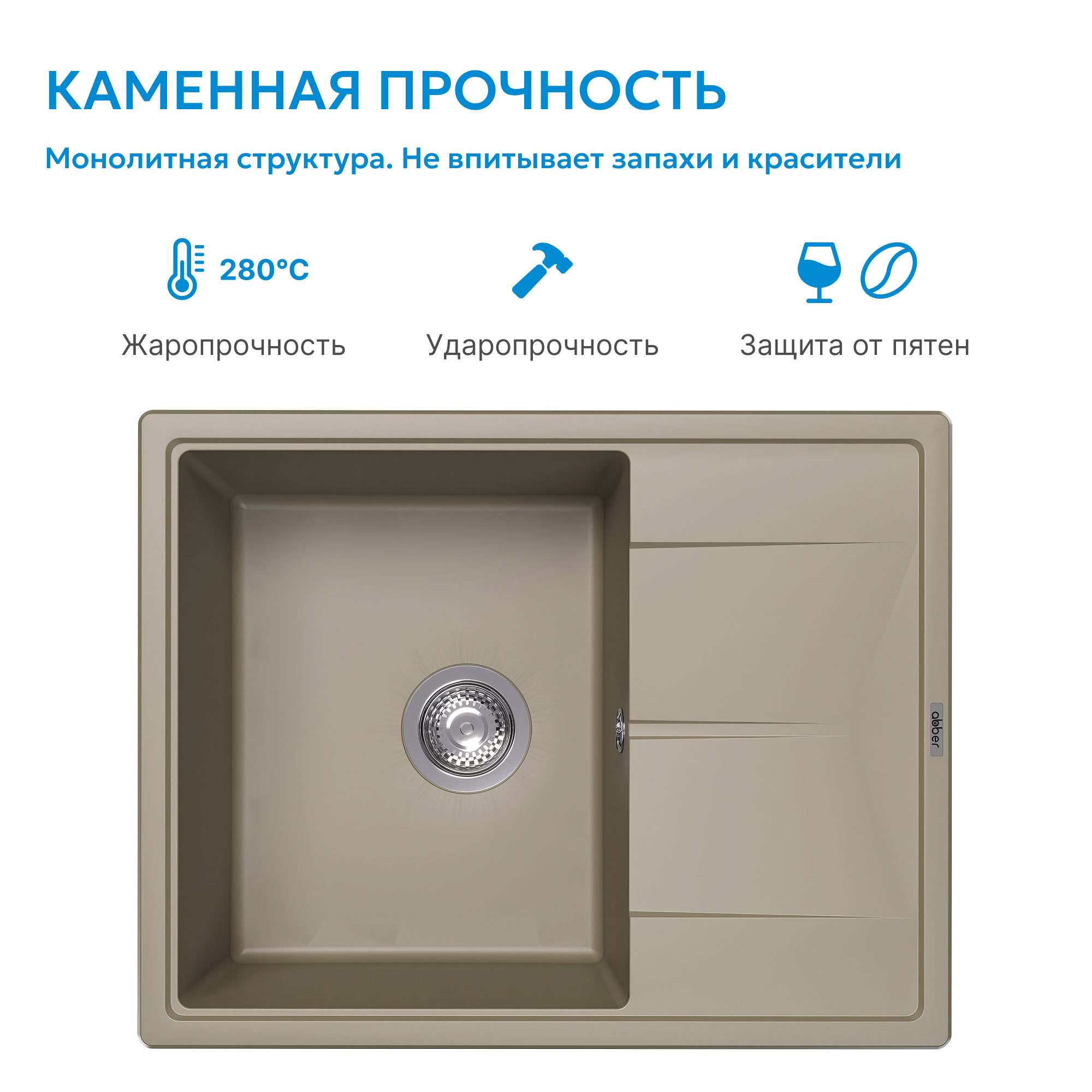 Кухонные мойки ABBER из кварцевого композита — это долговечность, надежность и простота в уходе. Лаконичный, сбалансированный дизайн Песочной кварцевой мойки 65х51х21,7см и ее натуральный цвет подойдет почти к любому стилю кухни. Вы можете выбрать мойку с крылом или без. Чтобы очистить мойку, не нужно использовать какие-то специализированные средства. Кварцевая мойка не боится повреждений, не окрашиваются продуктами. Как натуральный камень, но лучше и дешевле!