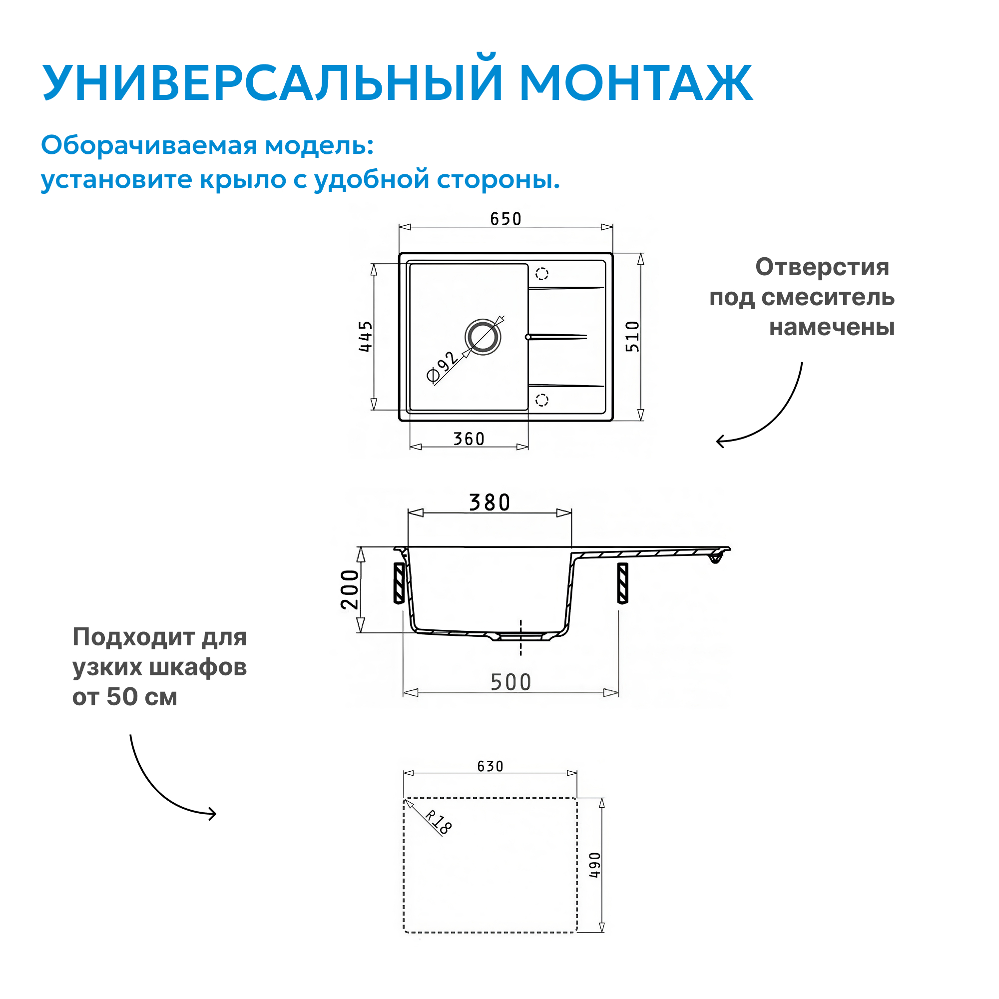 - Удобство монтажа — предусмотрено намеченное отверстие под смеситель, что облегчает установку и позволяет выбрать оптимальное положение.