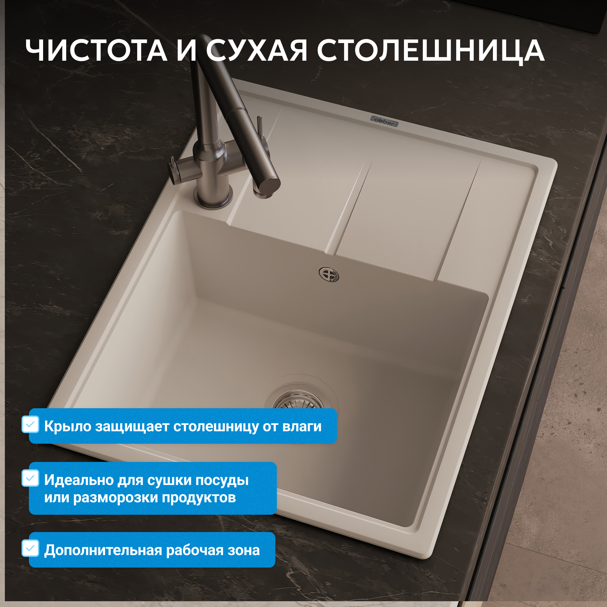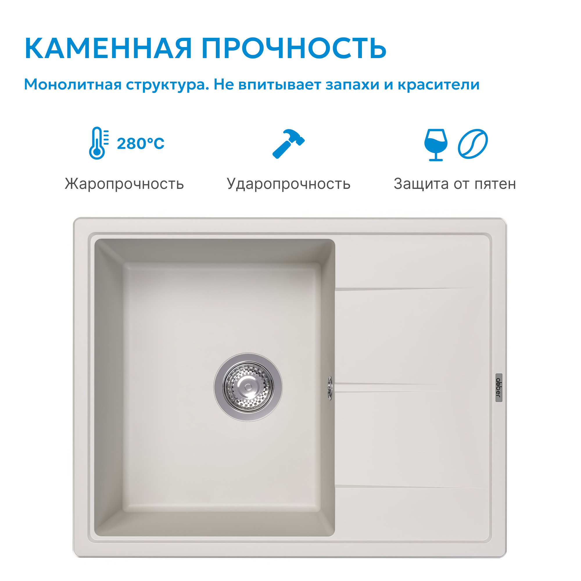 Кухонные мойки ABBER из кварцевого композита — это долговечность, надежность и простота в уходе. Белая кварцевая мойка 65х51х21,7см — неизменная и неустаревающая классика. Вы можете выбрать мойку с крылом или без. Чтобы очистить мойку, не нужно использовать какие-то специализированные средства. Кварцевая мойка не боится повреждений, не окрашиваются продуктами. Как натуральный камень, но лучше и дешевле!